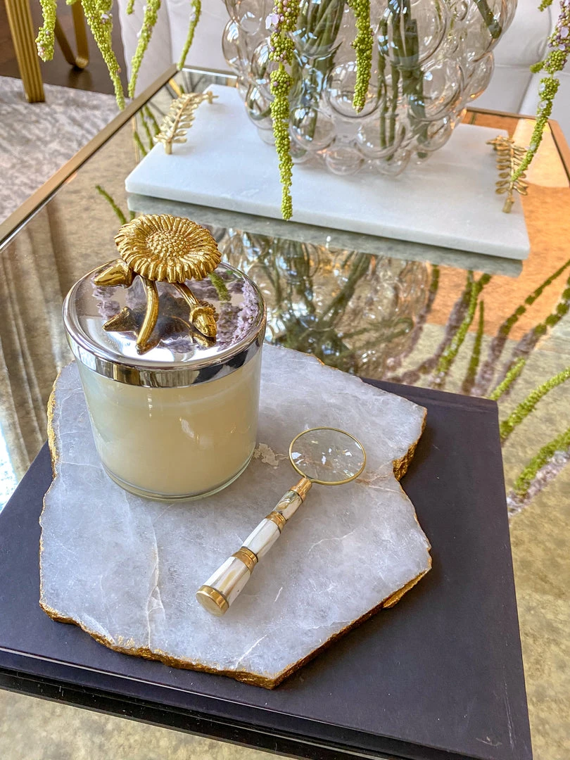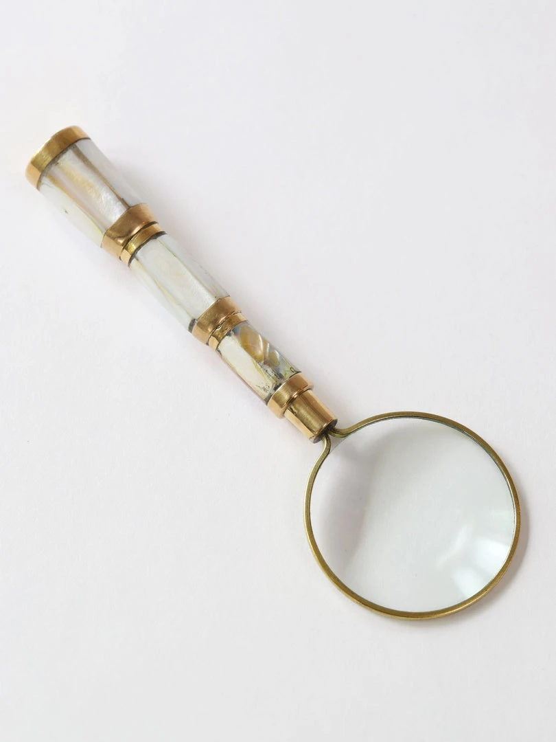 Description: This gold magnifying glass with a beautiful pearl stone handle adds glamour to your display.