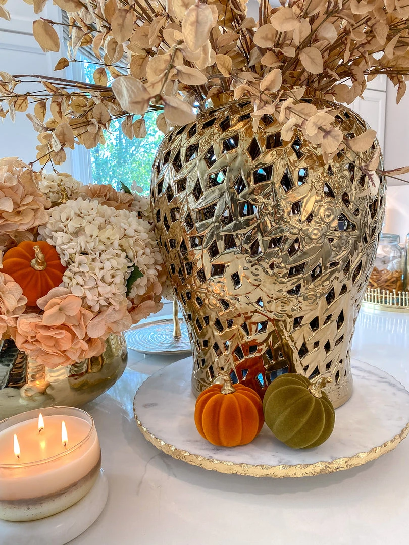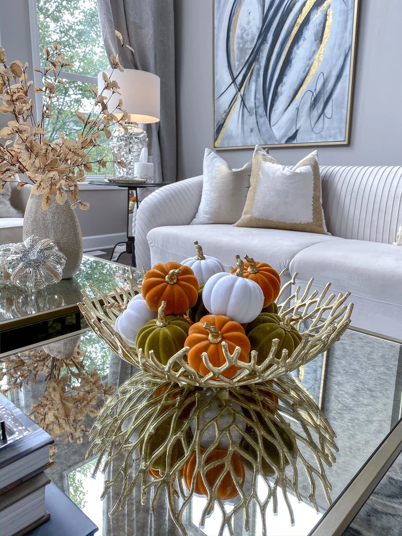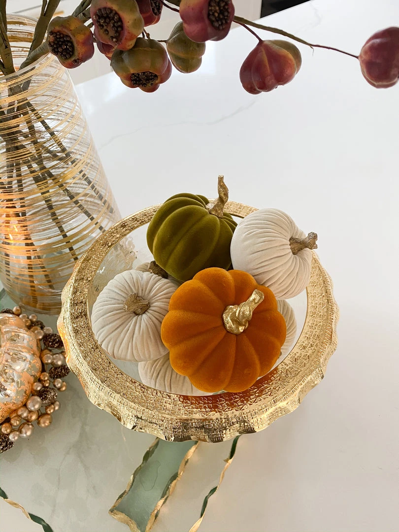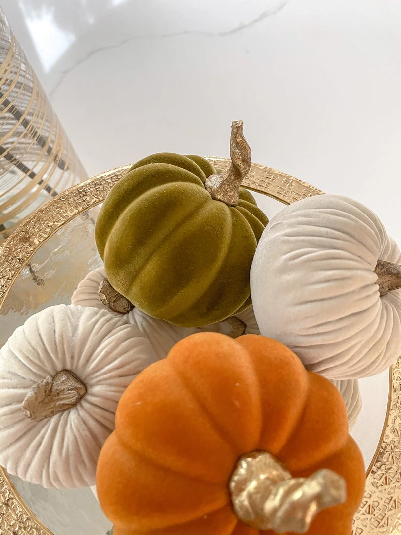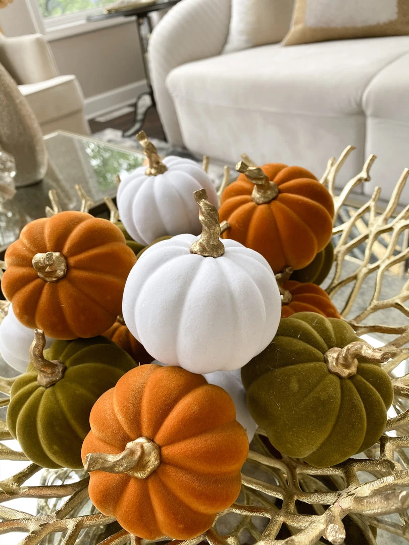 Description: This small, orange velvet pumpkin adds a pop of glamour to your fall decor! We love the gold stem!