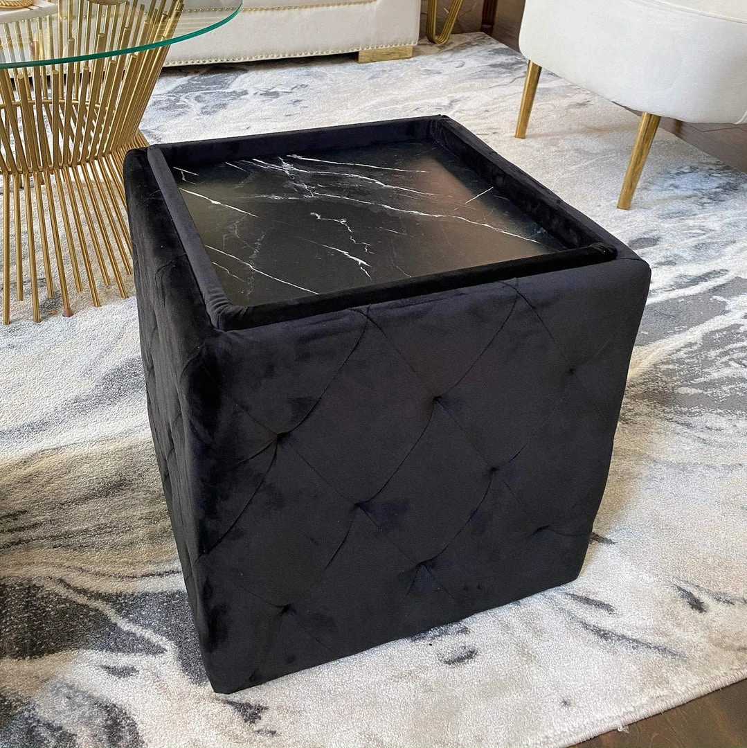 The Inspire Me! Home Décor Genevieve Ottoman features beautiful soft velvet upholstery and is extremely versatile in its functionality. It provides comfortable seating for your family and guests, storage, and turns into a beautiful side table by reversing the lid. Reversing the lid reveals a lux inset faux black marble tray that you can use as a small coffee table or a table for any of your entertainment needs. The Genevieve Ottoman features all-around tufting, instantly adding a luxurious touch to your space. It provides a great amount of space for hidden storage. Perfect for shoes, small toys, remote controls, wires, and so much more. This ottoman will ship fully assembled, so that you can put it to use right away without worry. Fantastic for your own space and also great as a housewarming gift because of its versatility and usefulness.