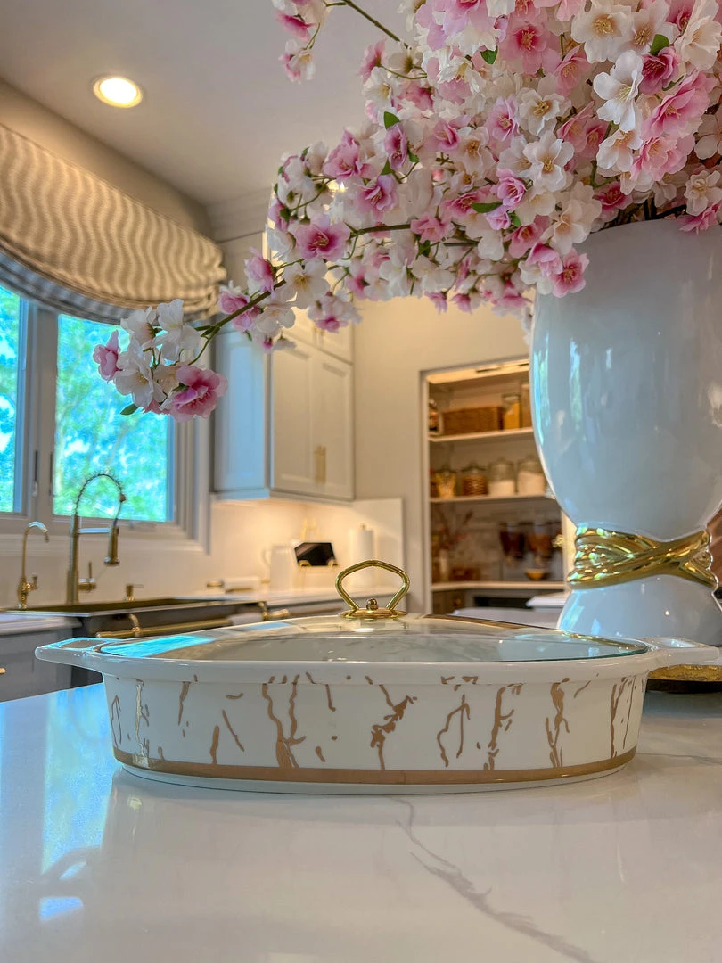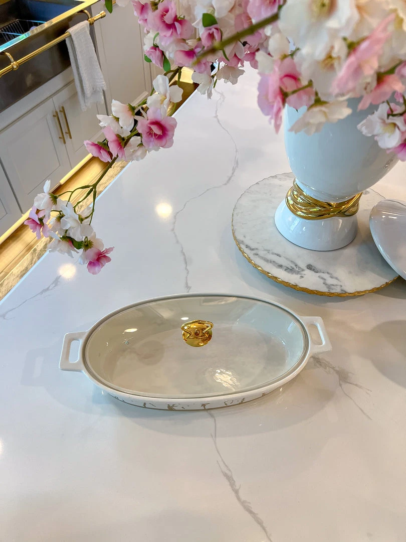 Description: This white and gold marbled print oval ceramic dish is perfect for making a statement at your next dinner party.