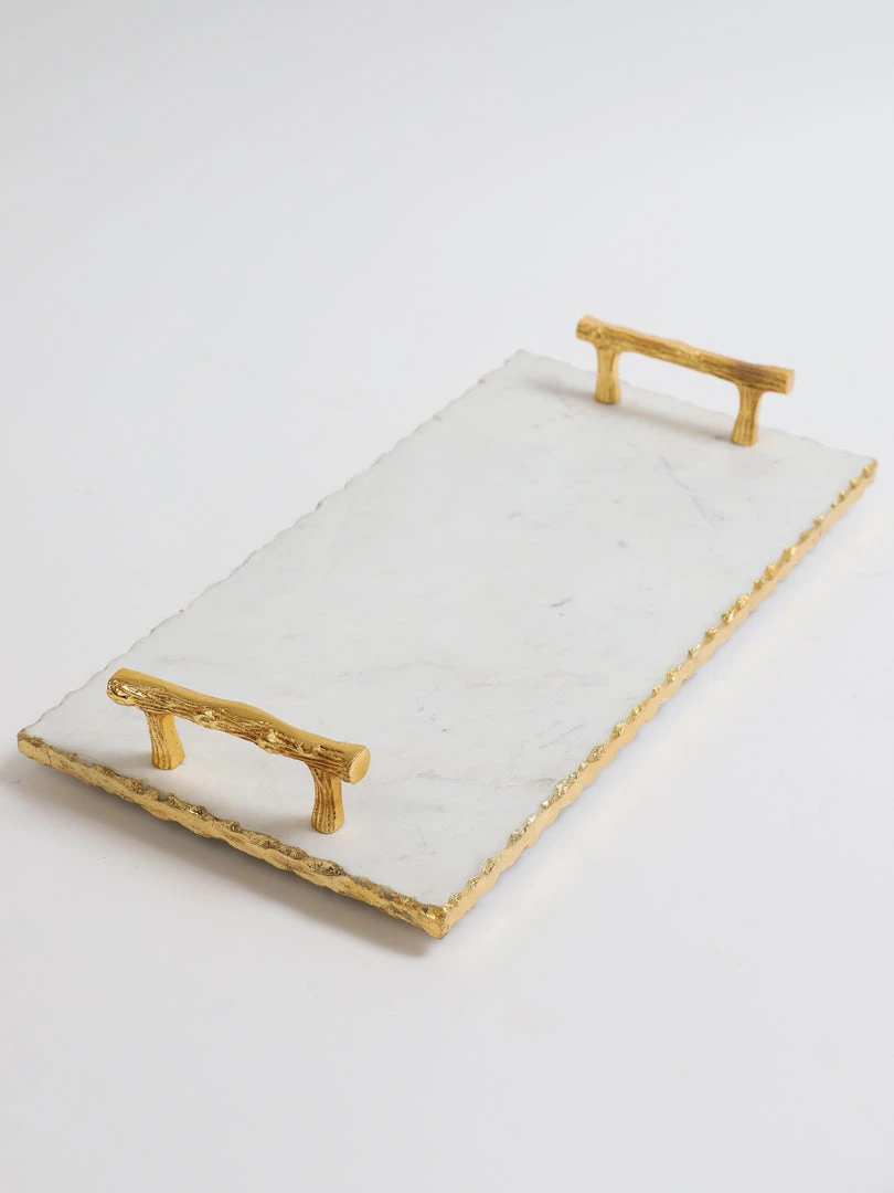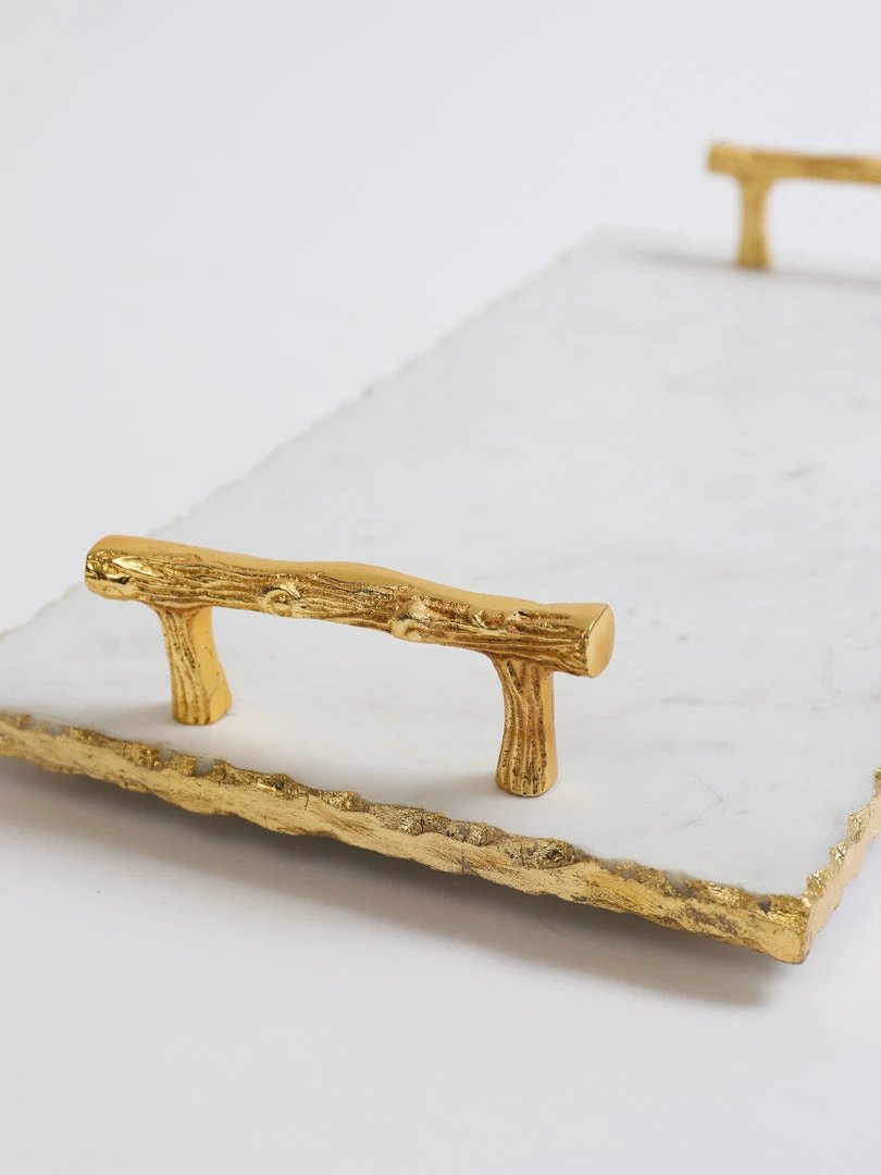 Description: This rectangle marble tray features gold hammered edges and beautiful textured gold handles and is very versatile! Use it to layer your decor or to serve your favorite snacks or drinks.