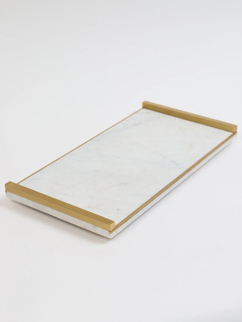 Description: This white marble tray features gold handles and a beautiful gold edge. It is simple yet elegant and very versatile in its use. Perfect to hold your canister sets!