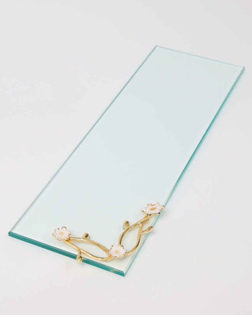 Description: This beautiful rectangular glass tray has stunning gold details with a cherry blossom design!