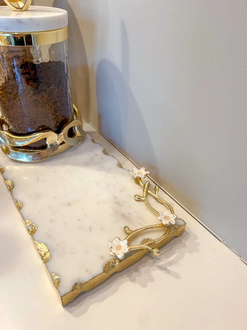 Description: This small rectangular marble tray has stunning gold details with a cherry blossom design! This will look perfect on your coffee station with any style canisters.