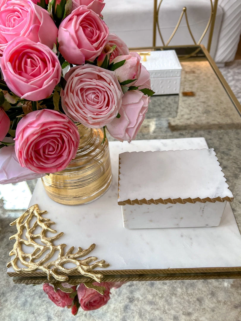 Description: This marble tray features a gold rim and an intricate gold-designed corner. Use this to style your favorite vase and candle, or to add some glam to your coffee table.