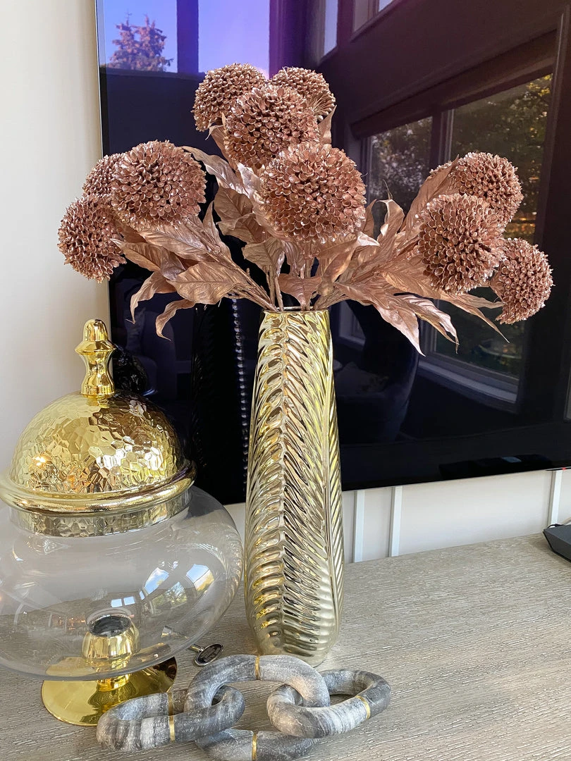 Description: This allium stem is the perfect glamorous floral stem! The rose gold metallic finish adds a new level of elegance to any floral arrangement!