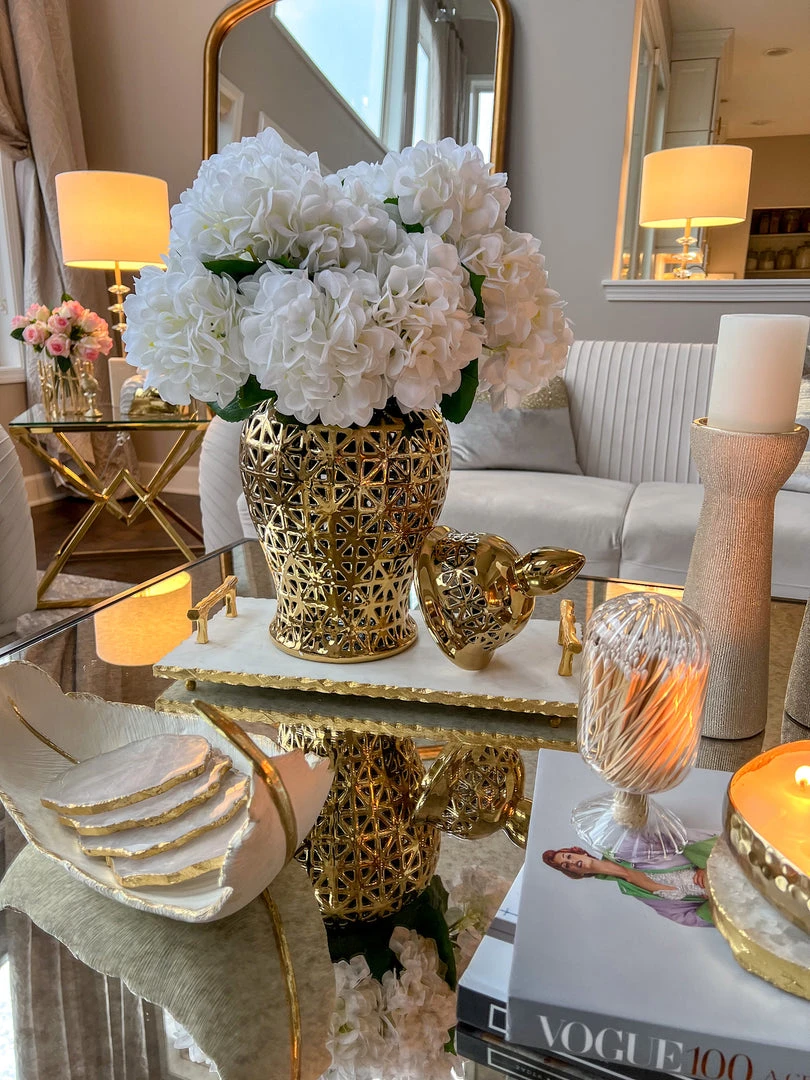 Description: These real quartz coasters have a beautiful distressed gold detail that will add an elegant touch to any surface in your home! They are very large and substantial and are great to layer with trays or candles!