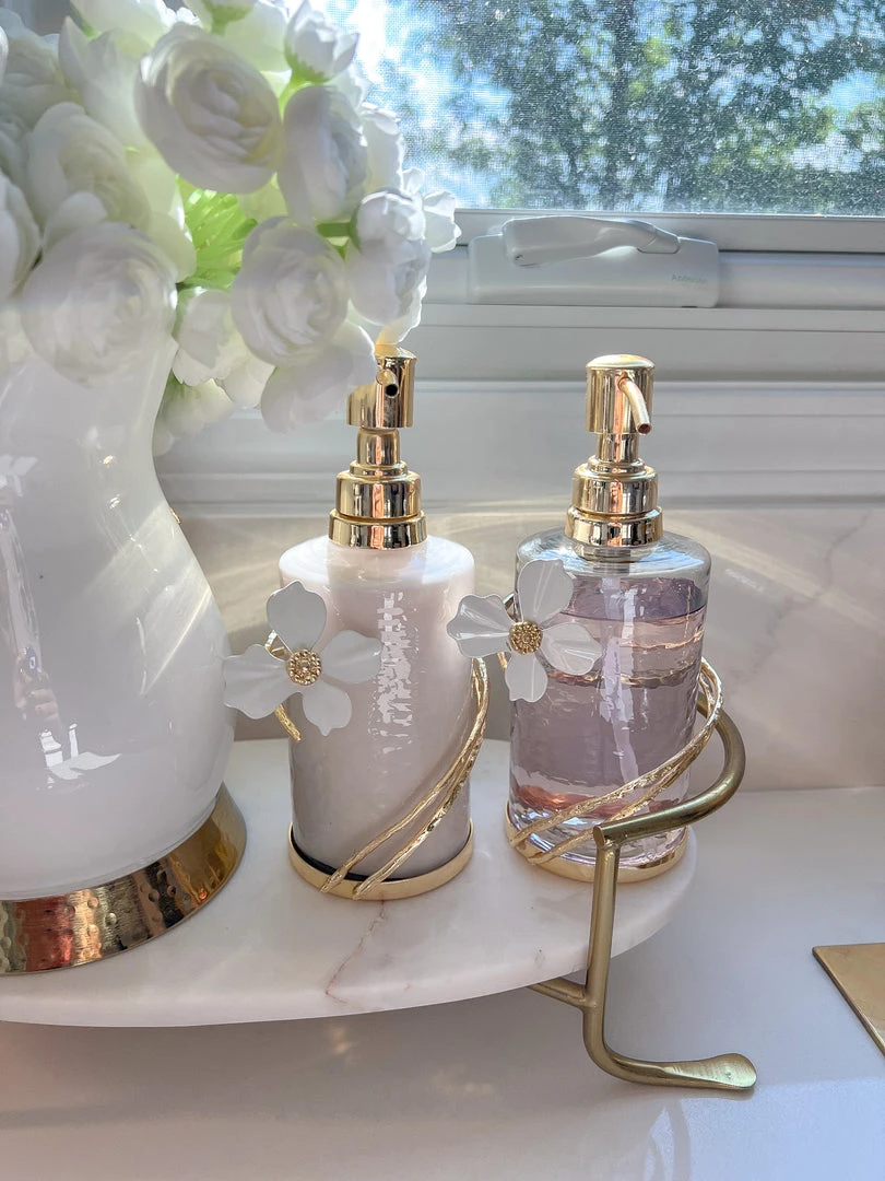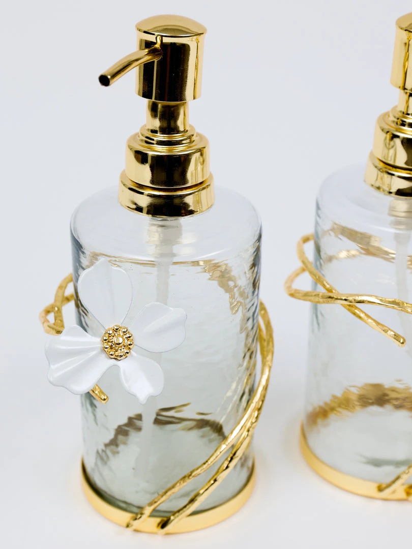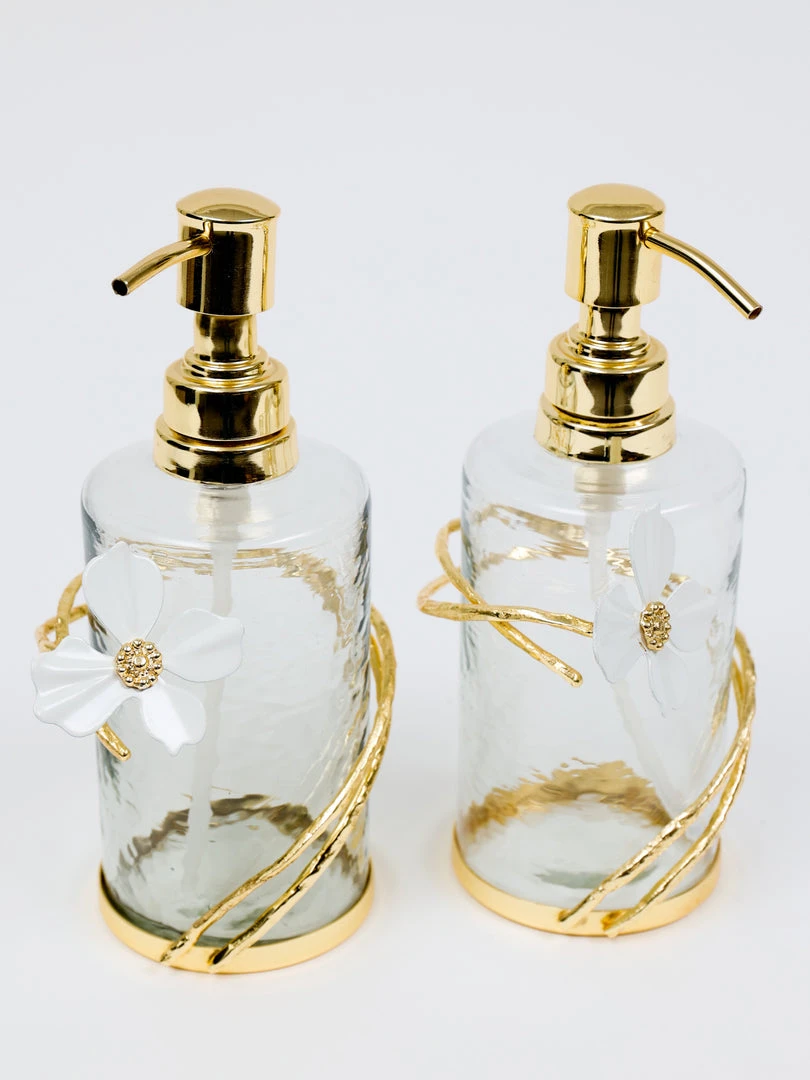 These hammered glass pumps are absolutely stunning! The gold tops and white jeweled flower details add such a luxurious touch. They look amazing on my bathroom counter and hold just the right amount of product. Very happy with this purchase!