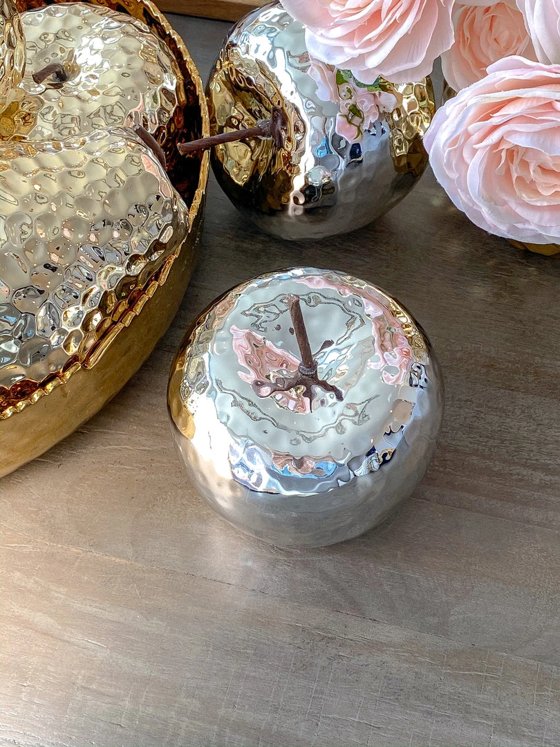 Description: This gorgeous textured apple is a unique piece for your table top décor! The silver glossy finish in the design make this very modern and elegant. The white finish will blend seamlessly into any other décor!