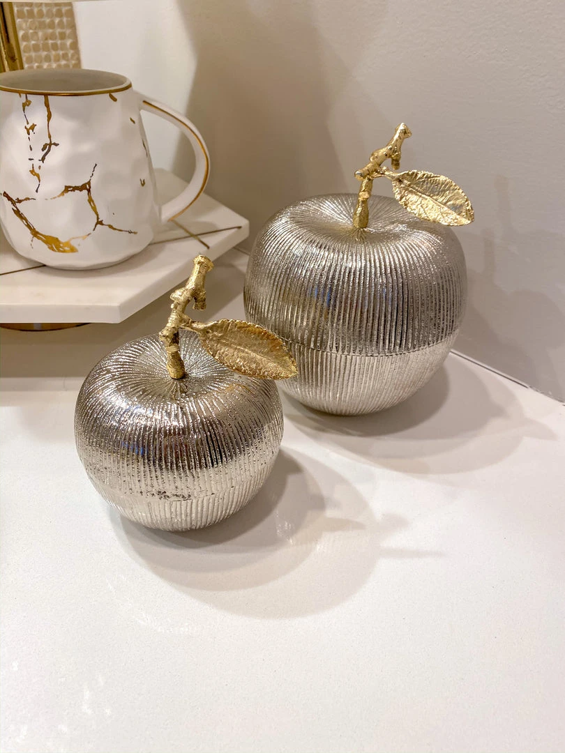 Description: Hide your trinkets and snacks in this adorable apple jar! A shiny silver apple is topped off with a gold stem abd leaf making this easy to blend into your existing home decor, and adds a cute fruity touch of glamour!