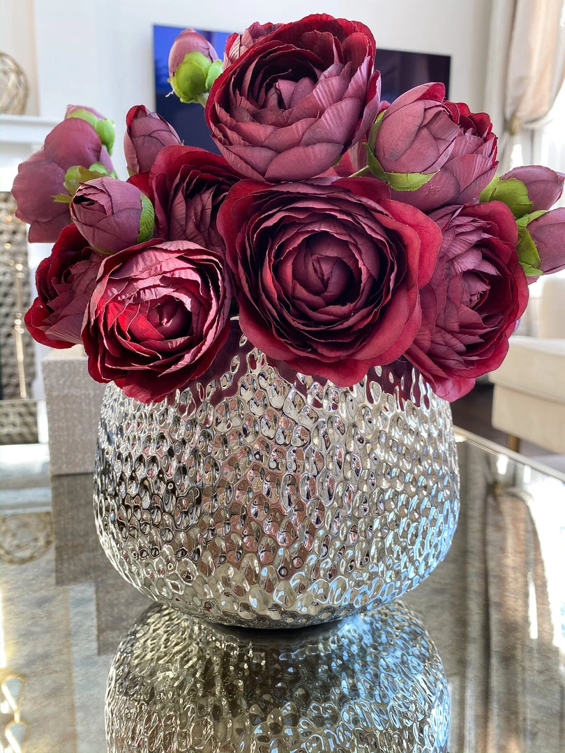 Description: This silver vase is a perfect accent for your faux florals with the hammered texture.