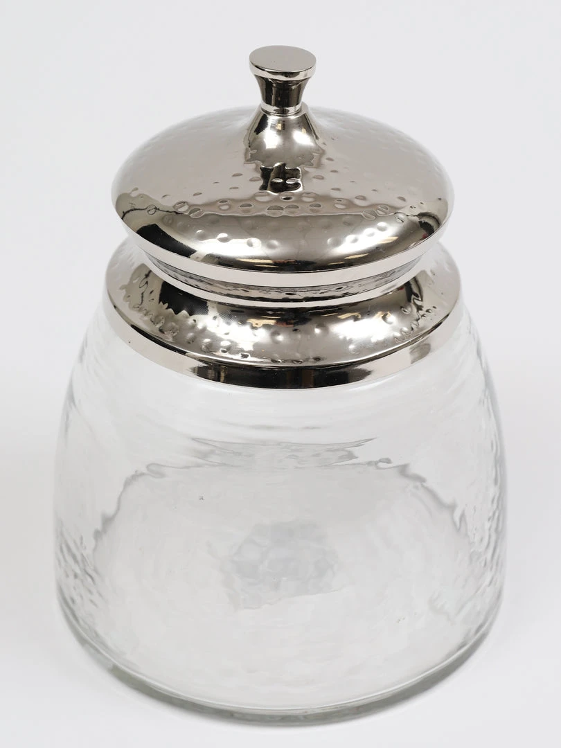 Description: This hammered glass jar with a silver plated lid can be used for so many things. Store your bathroom items or your favorite snacks.