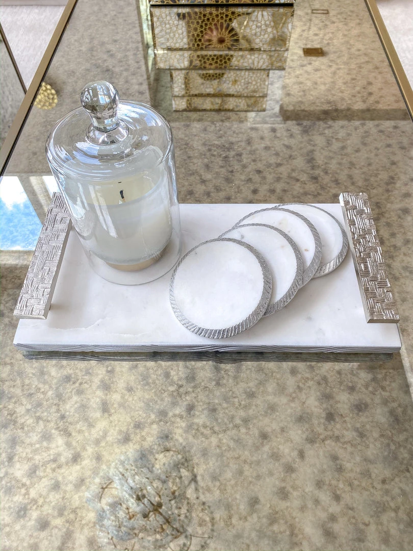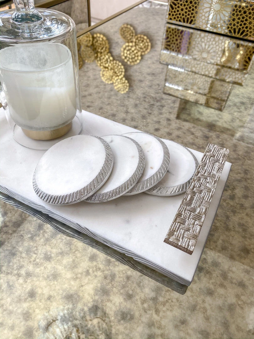 These white marble coasters come with a silver twisted rope edge and can be displayed on any matching tray or on your side or coffee table.