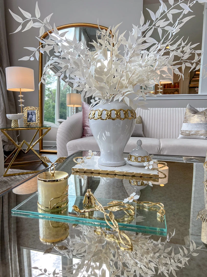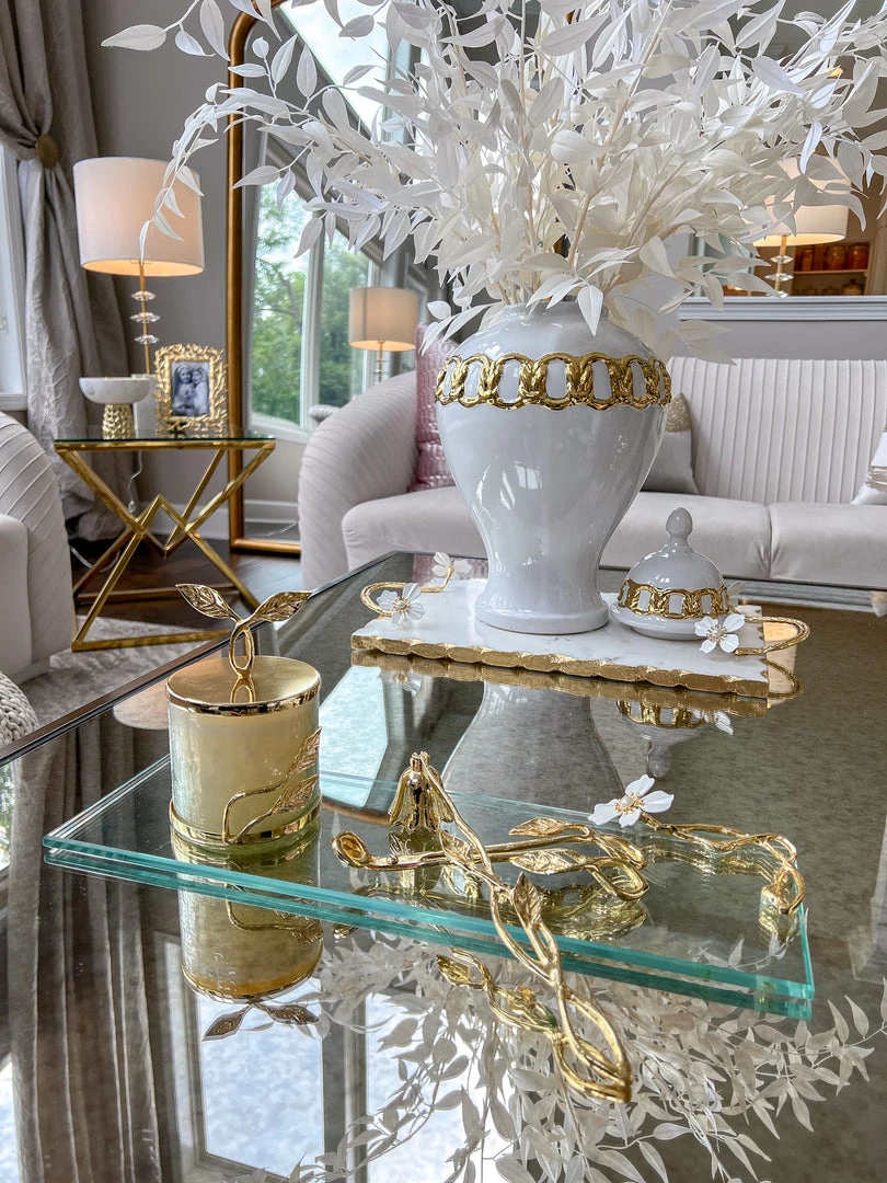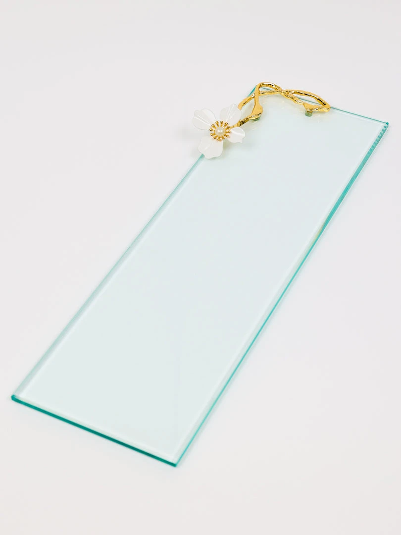 Description: This beautiful rectangular glass tray has stunning gold details with a white jeweled flower design!