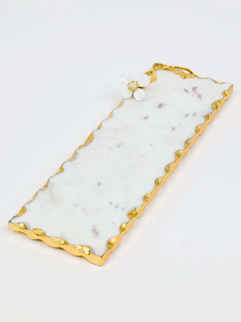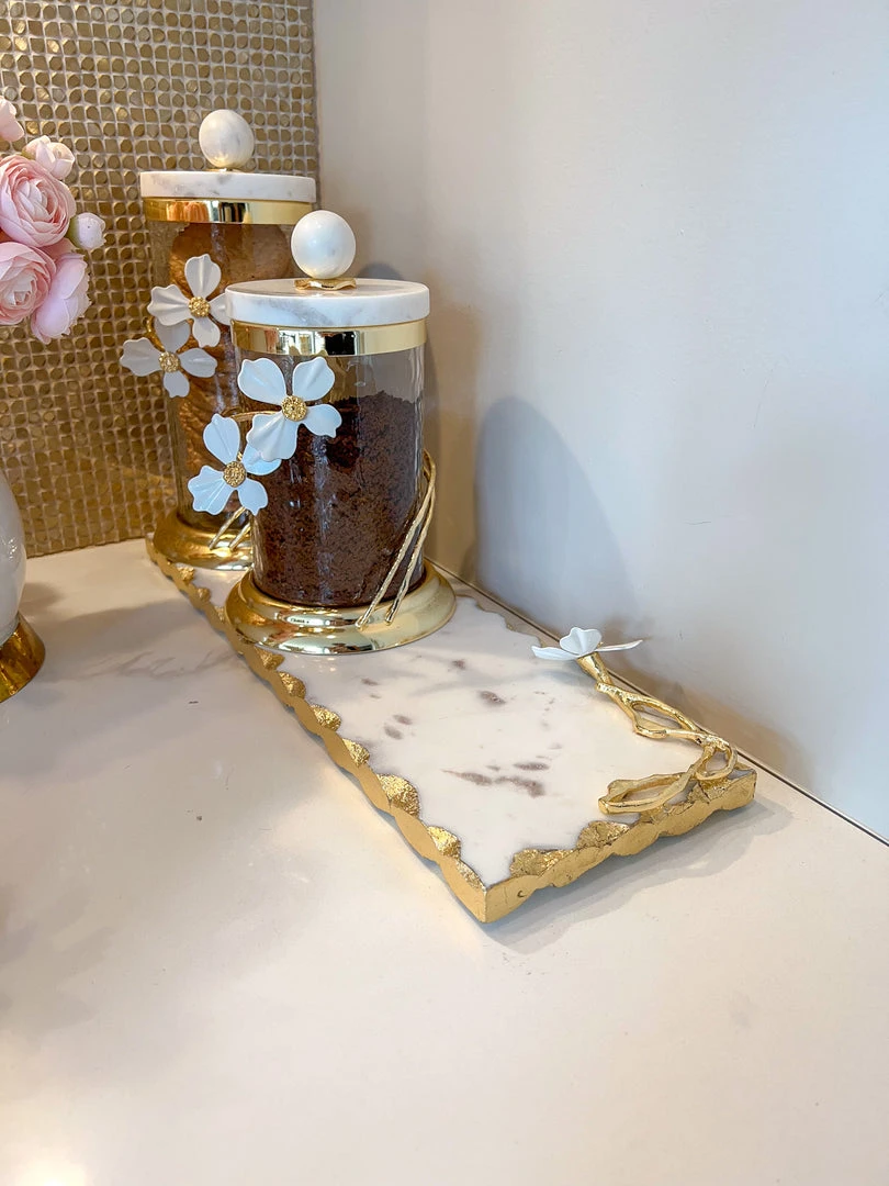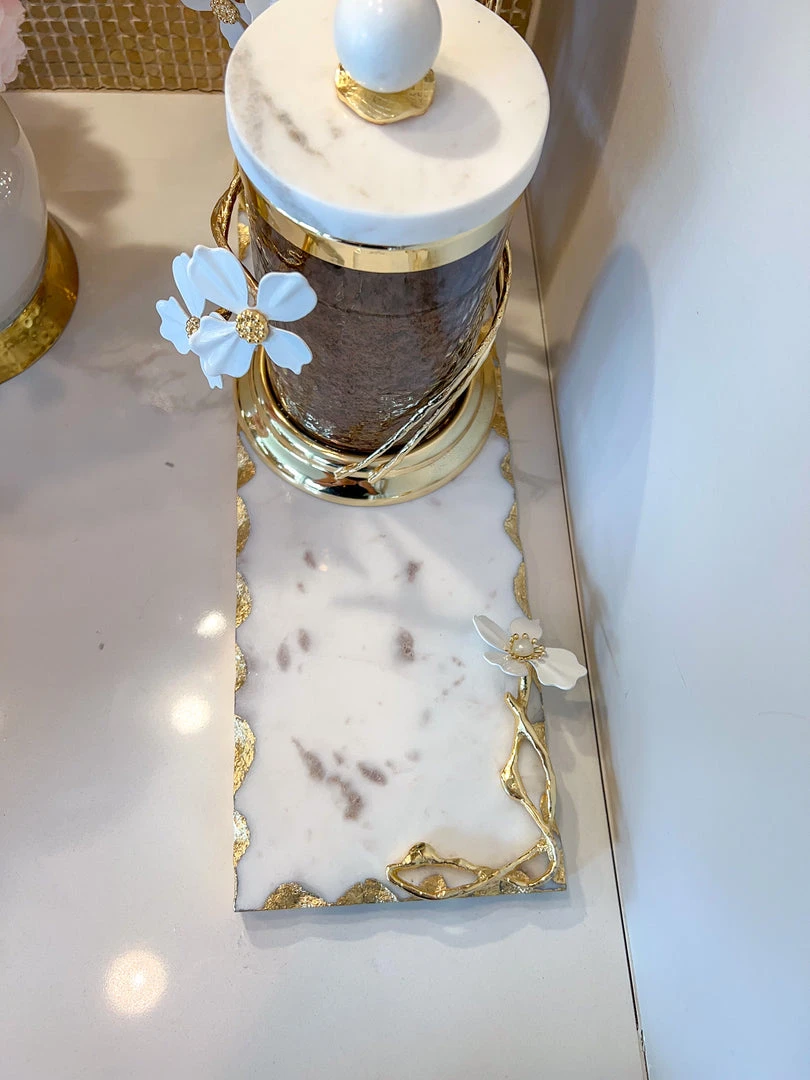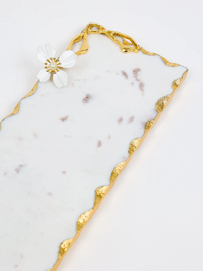 Description: This beautiful rectangular marble tray has stunning gold details with a white jeweled flower design!