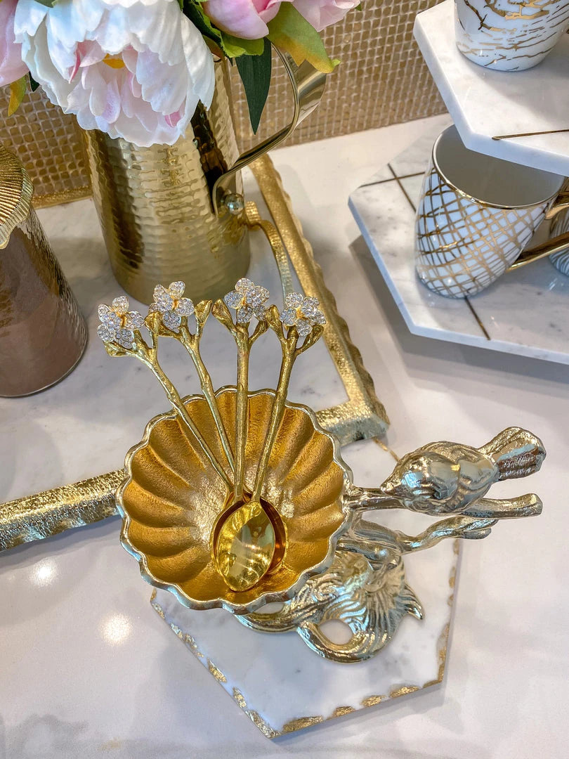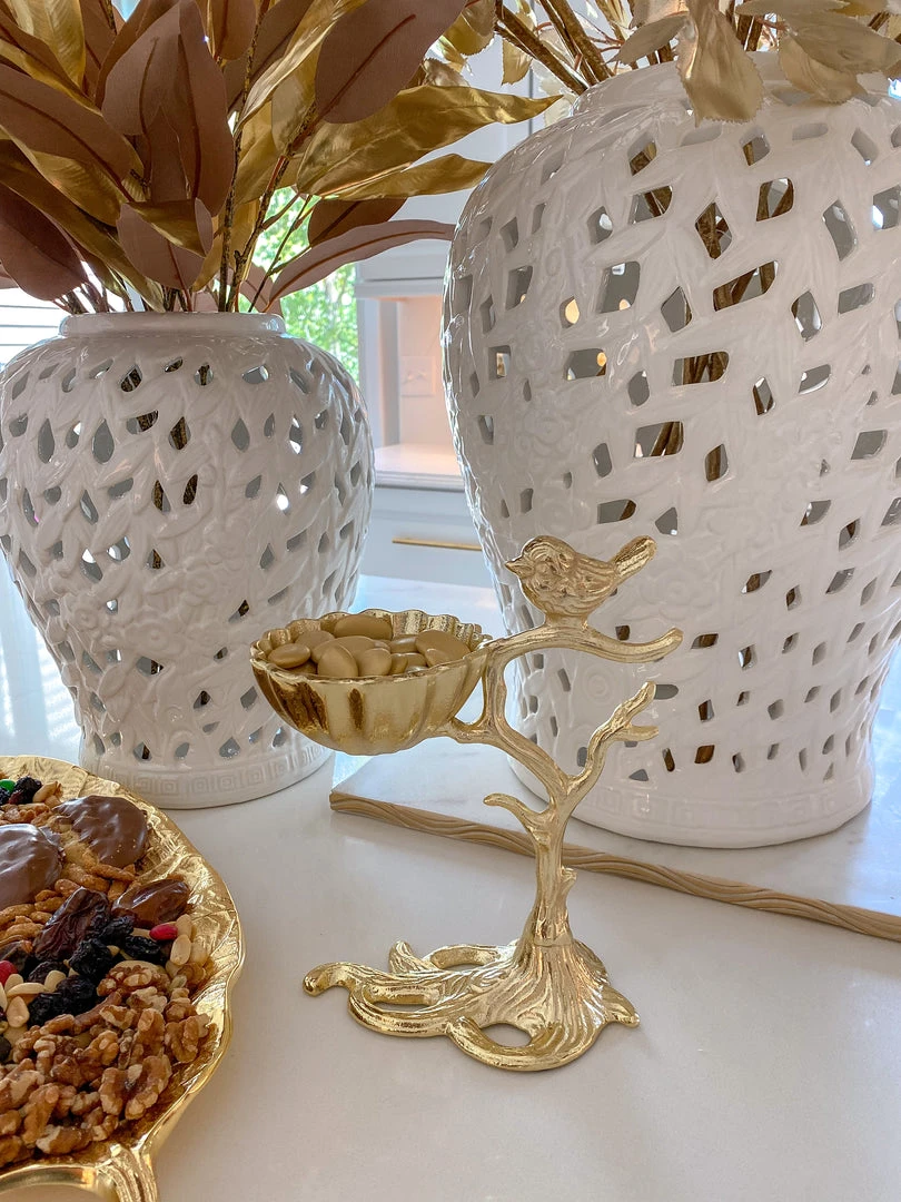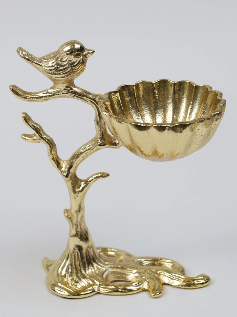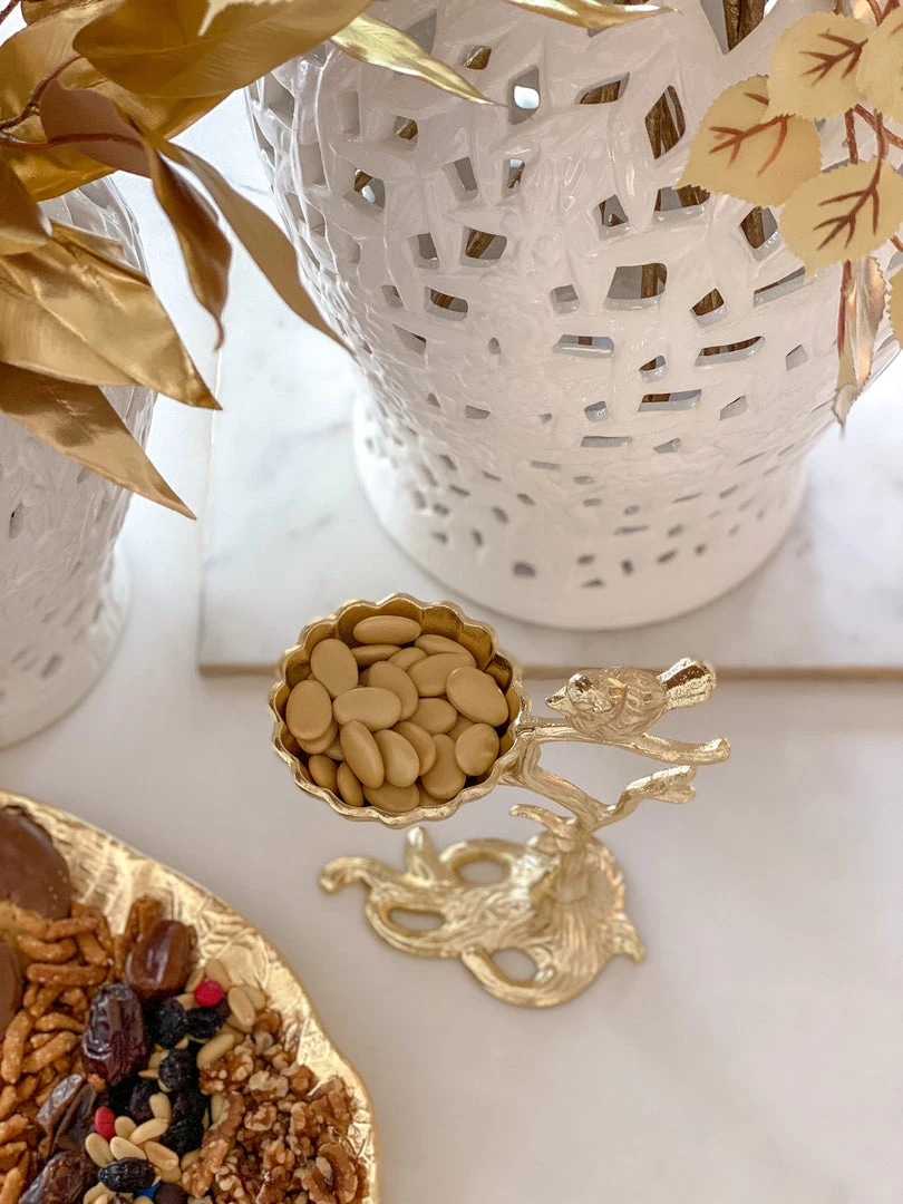Description: This beautiful decorative snack bowl will enchant your guests! A small bowl sits atop a golden tree, as a little bird waits by your favorite snacks!