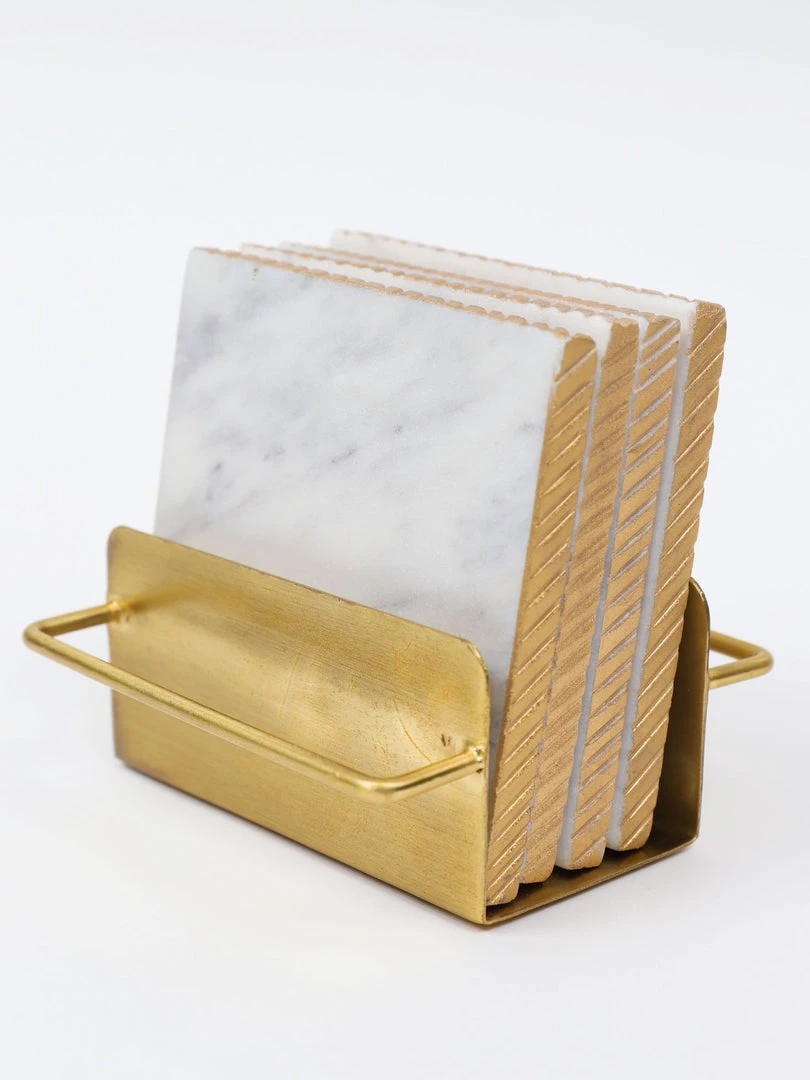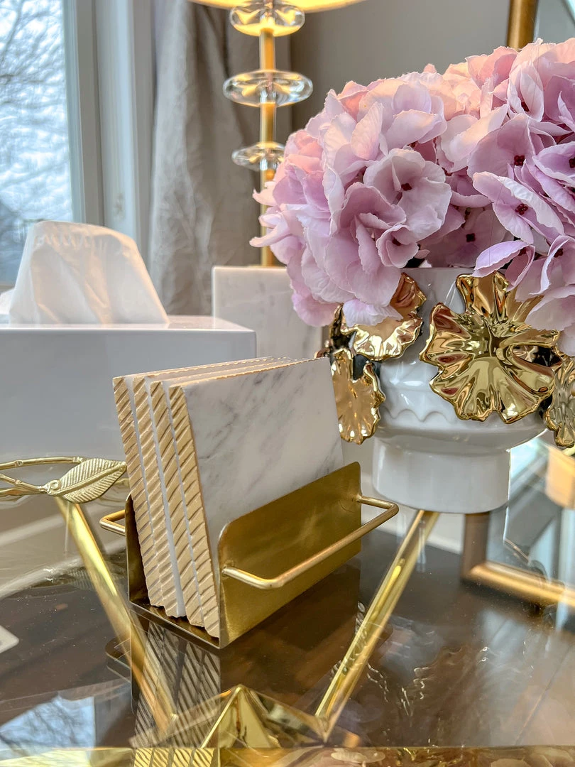 Description: These 4″ marble coasters with a gold edge with their beautiful hammered gold holder are absolutely beautiful to display on your coffee table.