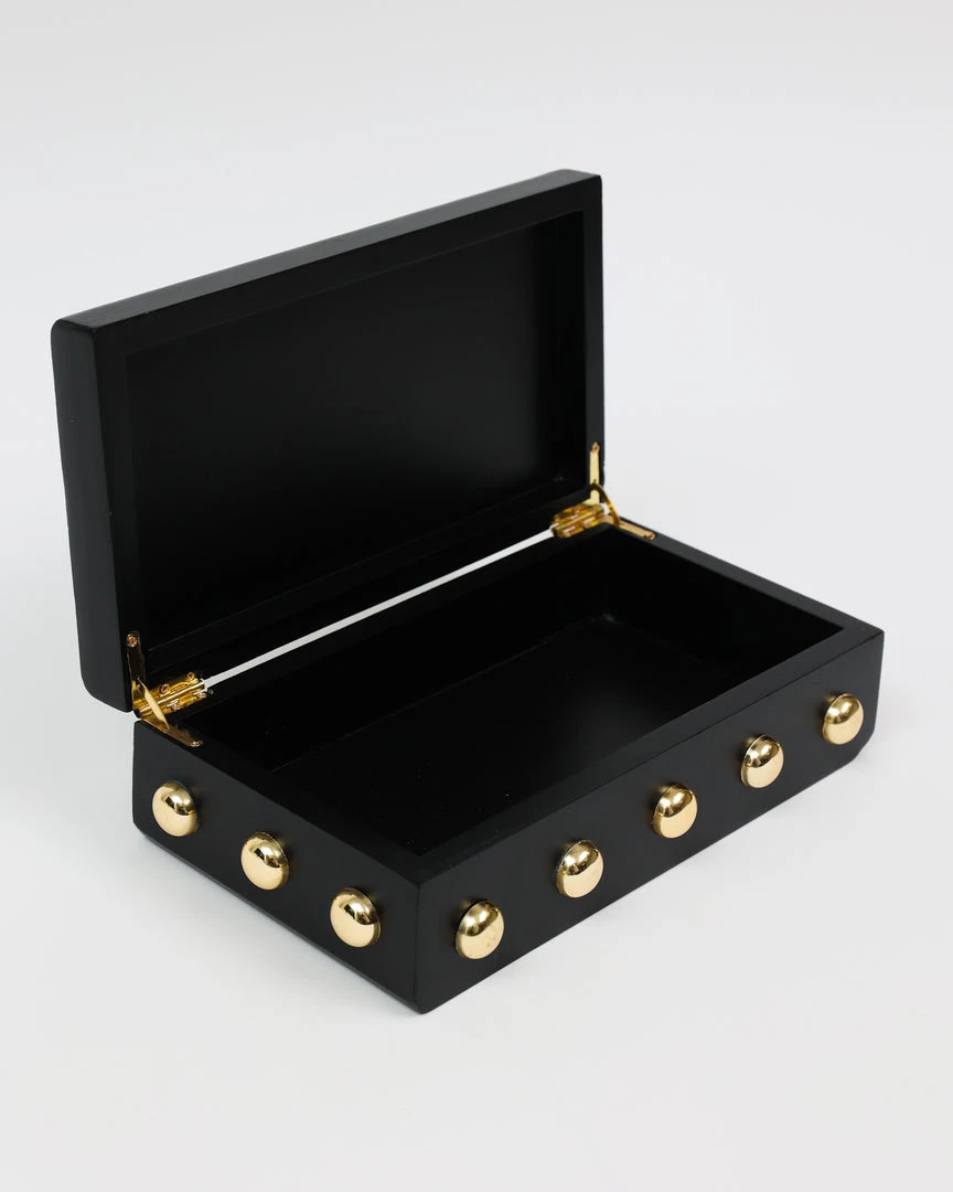 Description: This wooden box with its shiny gold studs is a statement maker.