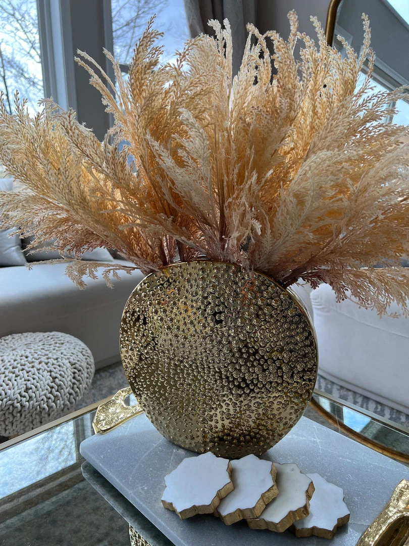 Description: The gold round vase is a beautiful addition to your home decor! The unique texture will help to elevate the look of your floral arrangements.