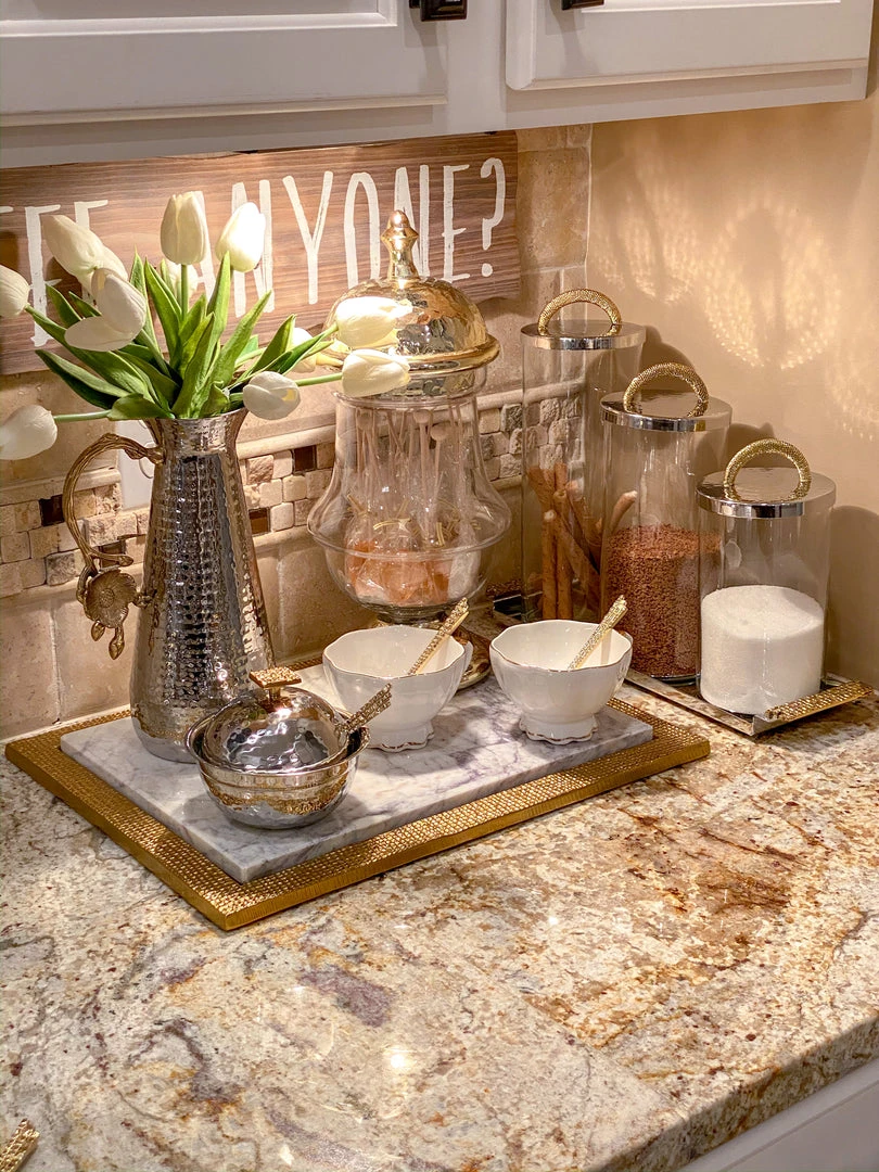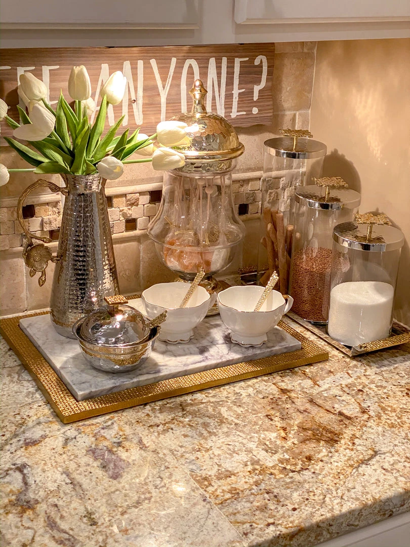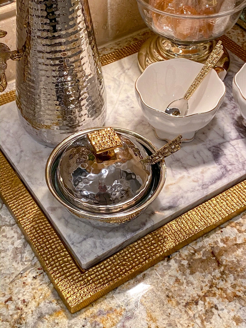 Serve sugar, honey and or jam in this pretty hammered bowl. Metal on the outside with a glass insert for easy wash and a mosaic spoon!
