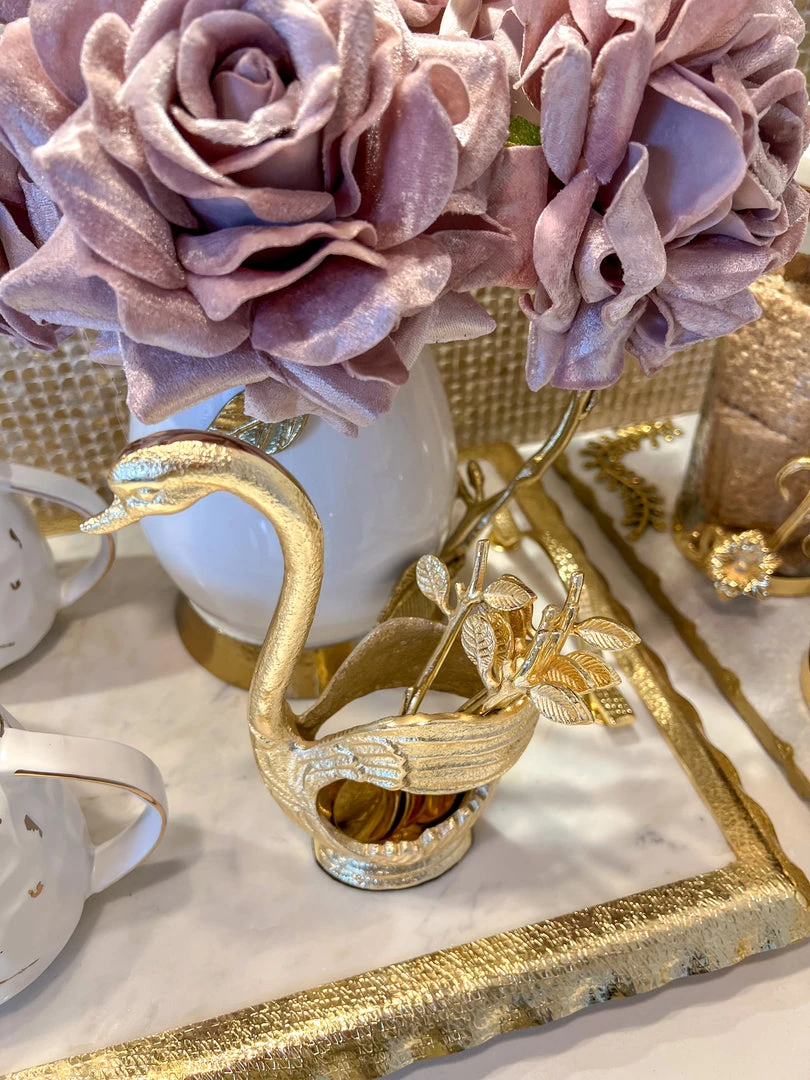 Description: This is such a stunning swan spoon holder which holds 6 intricate dessert spoons. This will be a welcome addition to your dessert station.