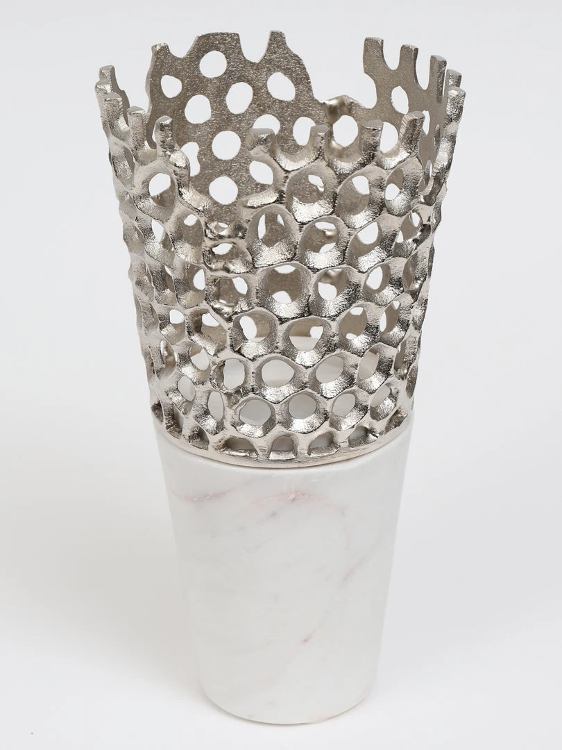 Description: This textured cut-out design vase has a substantial marble base and will look gorgeous with your favorite faux florals.