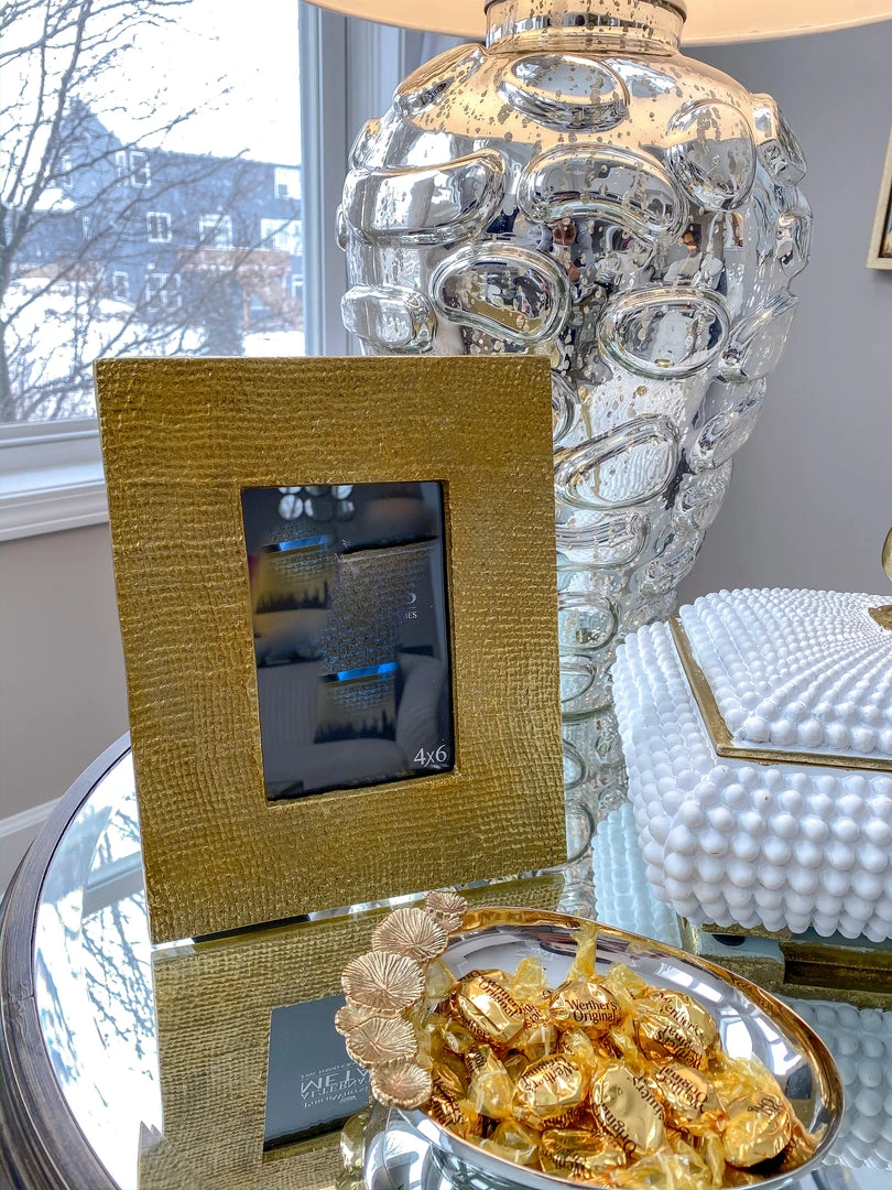 This textured gold photo frame adds a bit of a glam feel to any room. It holds 4×6 Photos.