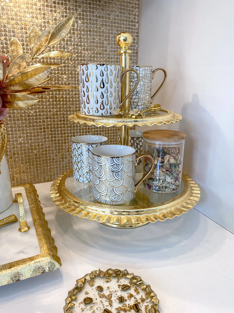 Description: This beautiful two-tiered cake stand creates such a strong silhouette! The glossy gold and Silver finish looking dazzling on the ripple textured details!