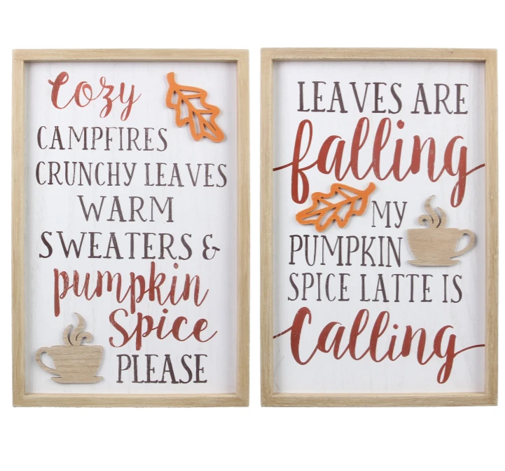 Description: These adorable wooden signs will put you in a festive mood for fall! We love the warm colors and creative text on these signs. Available in 2 styles!