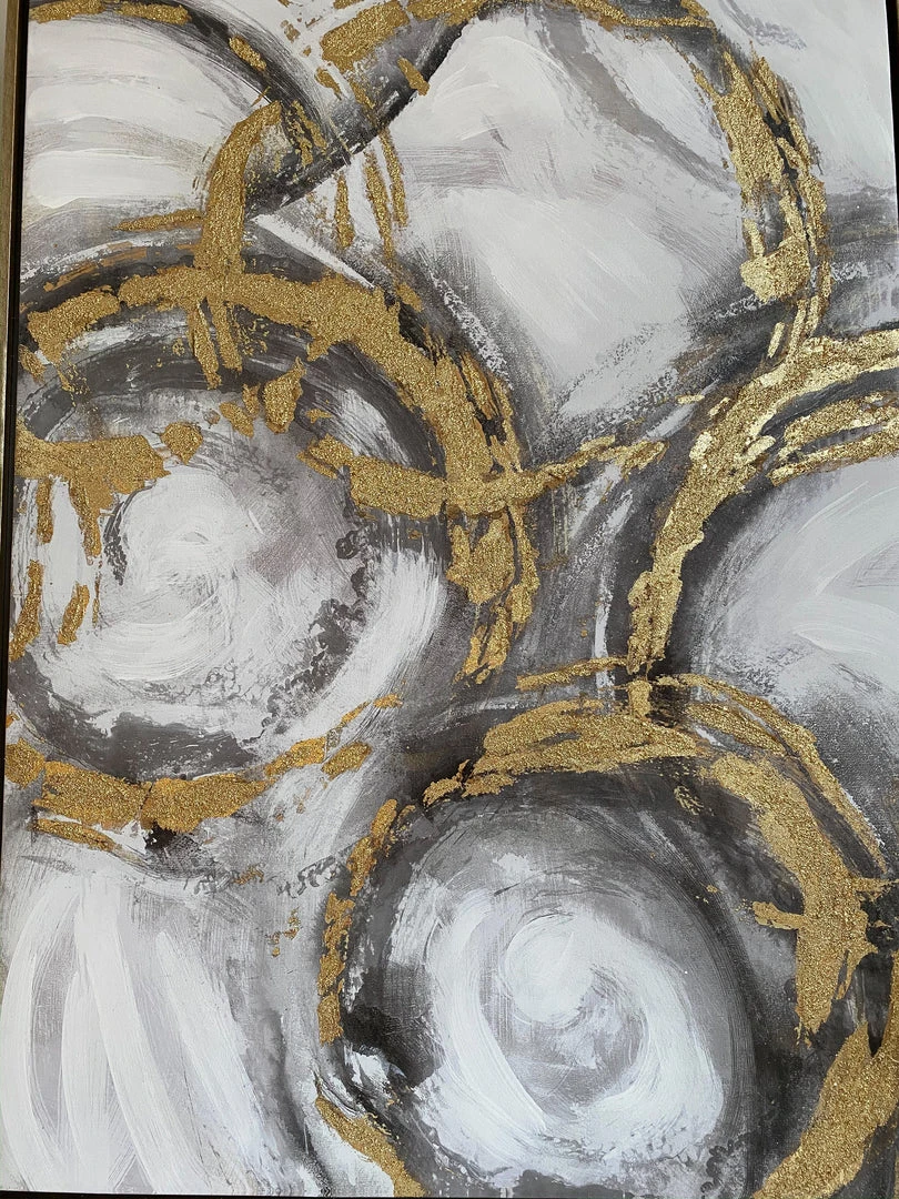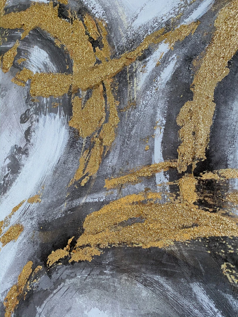 Description: This abstract oil painting has metallic accents of gold, black and gray to add interest to your wall.