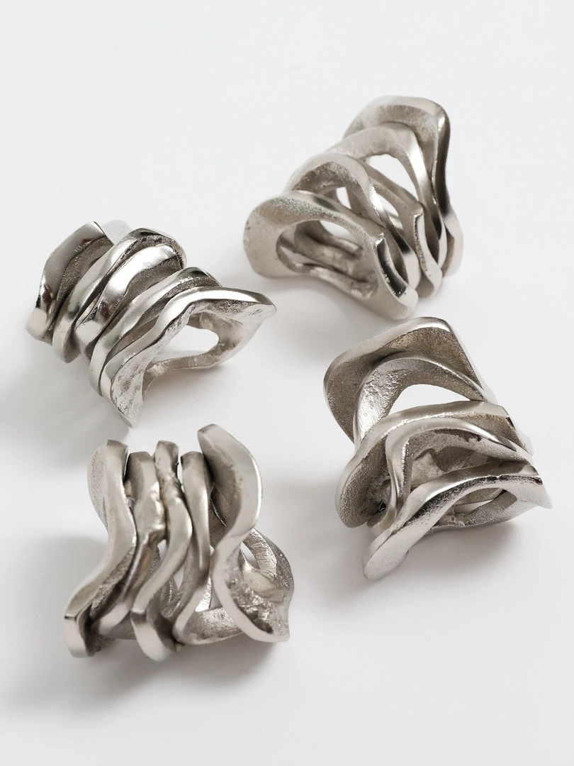 Description: These all-metal substantial wavy stacked napkin rings are absolutely stunning and will make a statement on your dining table!