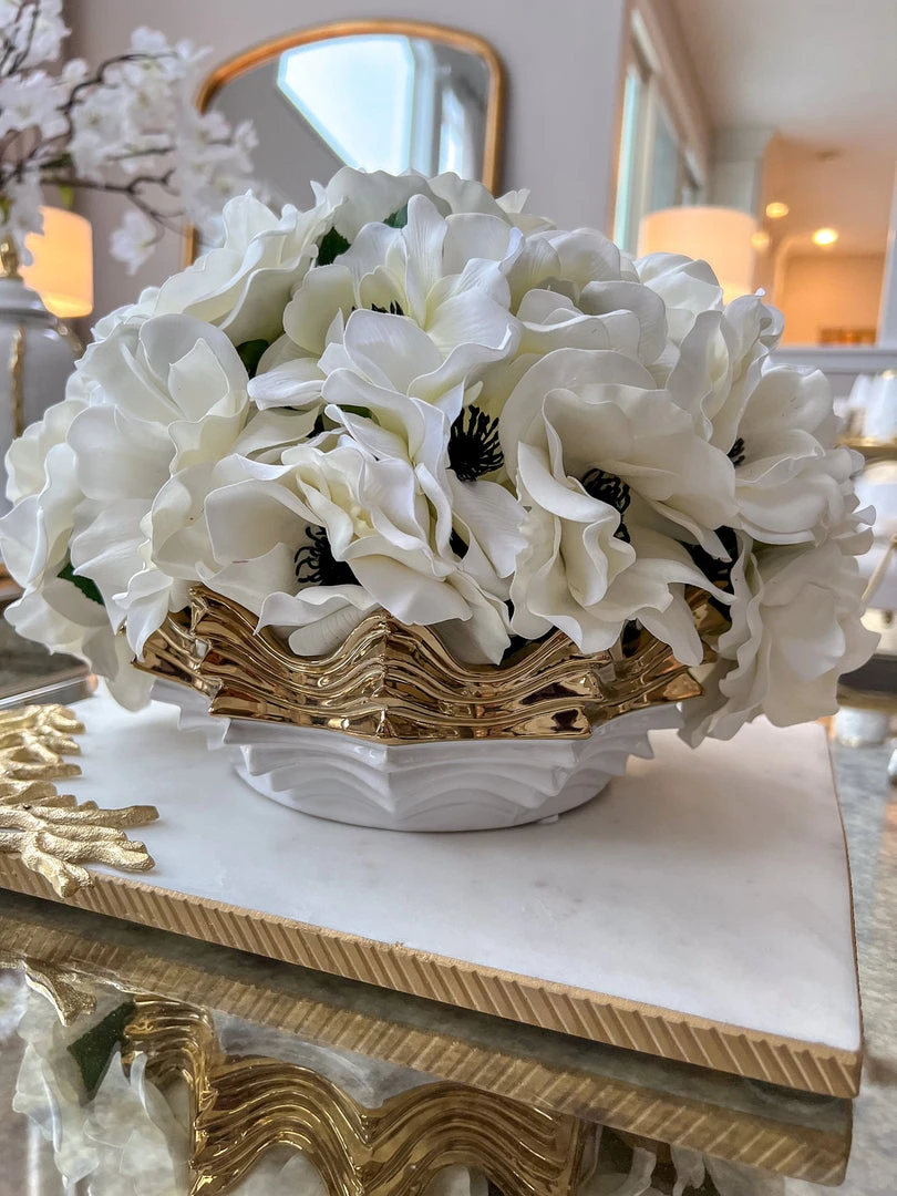 Description: This scalloped gold and white bowl will bring texture to your home! Fill it with bowl fillers or with your favorite snack.