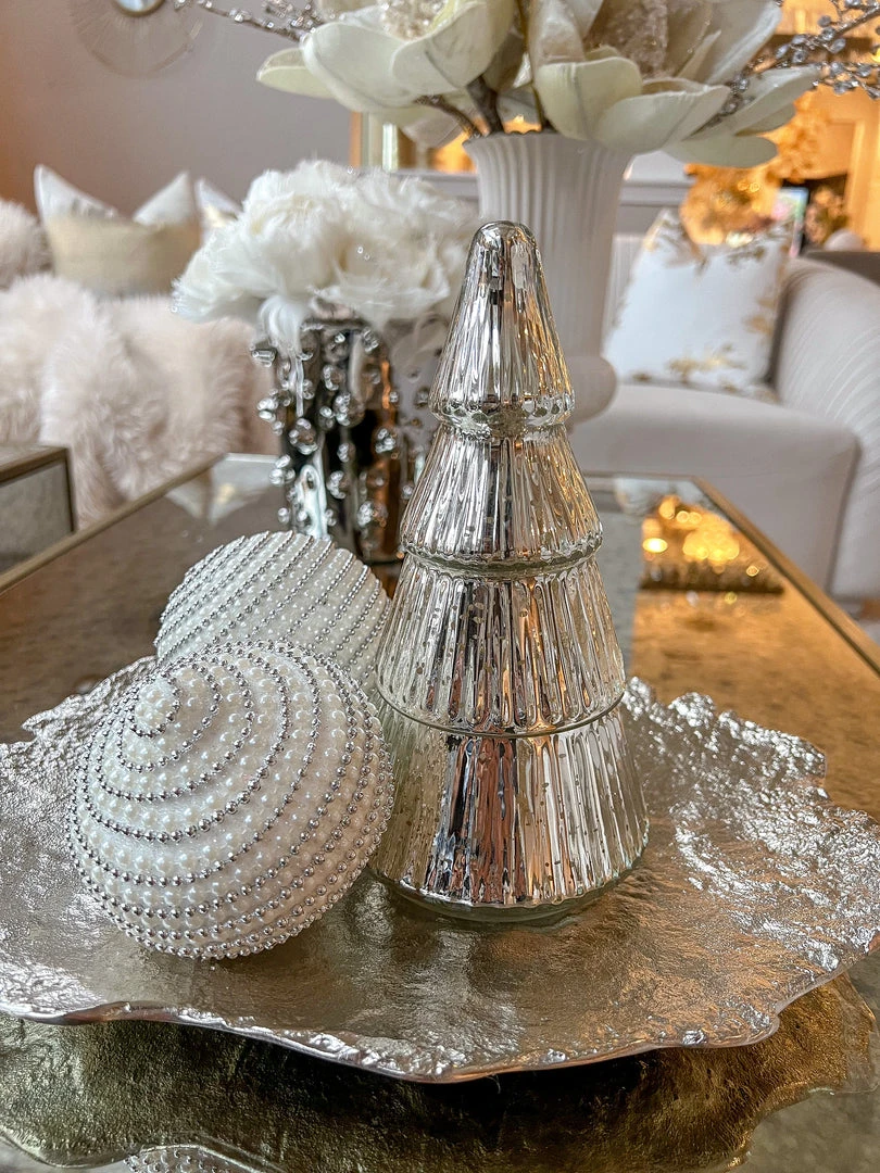 Description: The absolutely gorgeous white textured with silver beads in two different sizes make a stunning displayed on a tray or on your tree.