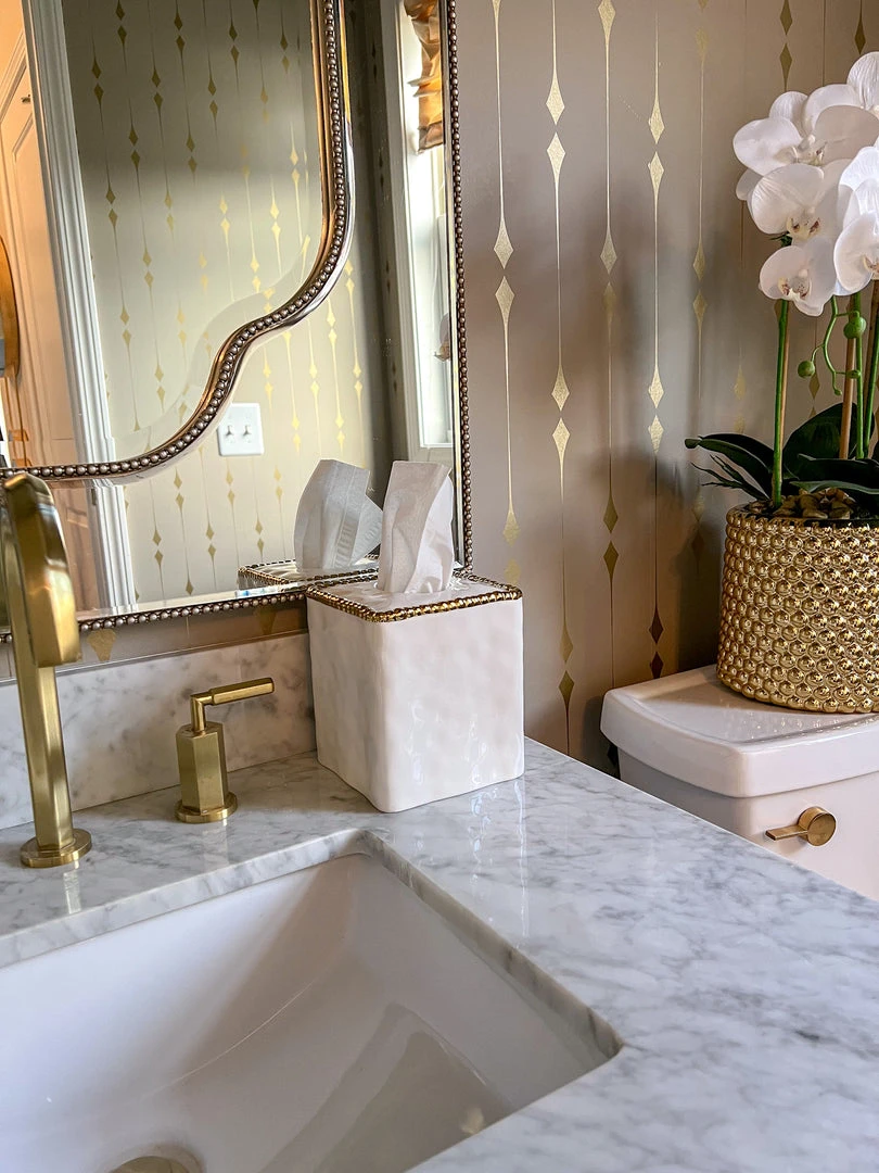Description: This piece is a stylish yet elegant way to display tissues on your vanity. Clean and classic, this piece will add a charming touch to any vanity. Made of high-fired porcelain with titanium beading.