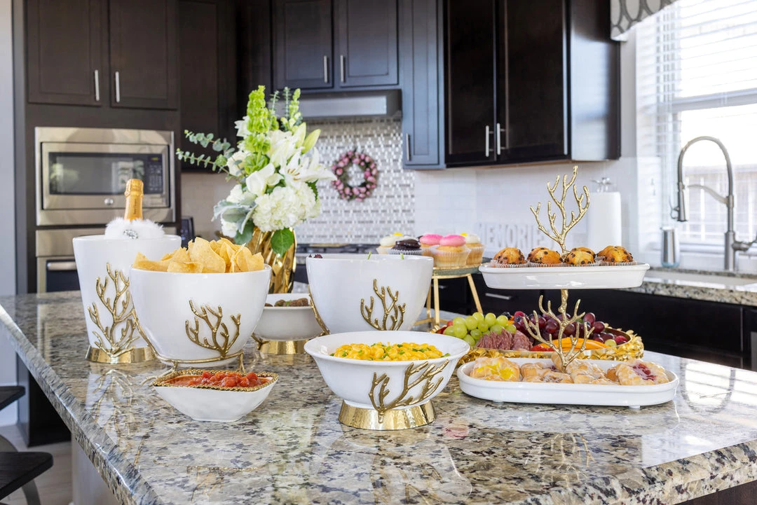 Description: This beautiful bowl is a great piece of elegant design. The gold textured details complement the glossy white ceramic to create a timeless look of sheer elegance and glam.