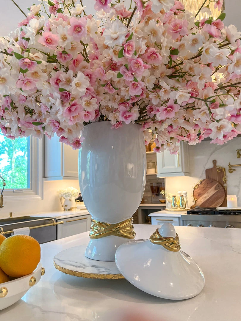 Description: Check out this substantial white and gold jar with matching white and gold detailed lid! This new style is a must-have! The white ceramic body has an elegant gold detail and is simply gorgeous!