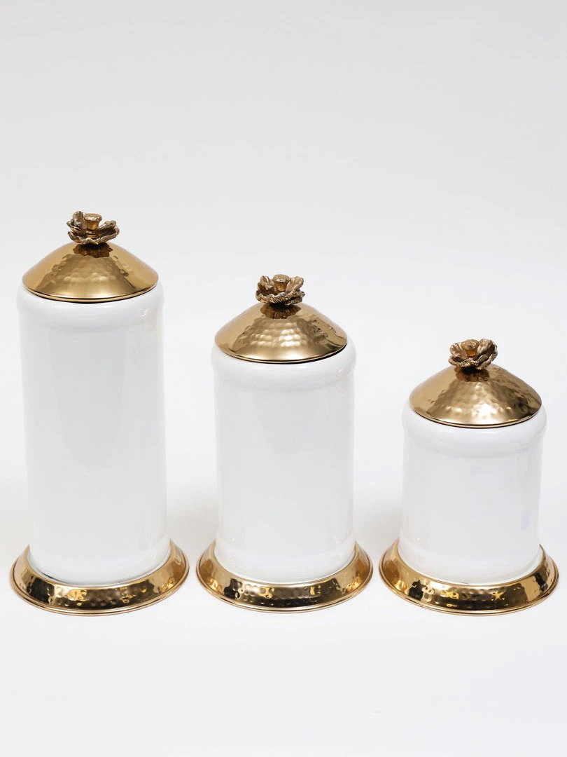 Description: These white ceramic jars feature a gold base and gold hammered lid with floral detail. These jars are such a cute addition to a coffee station or kitchen counter!