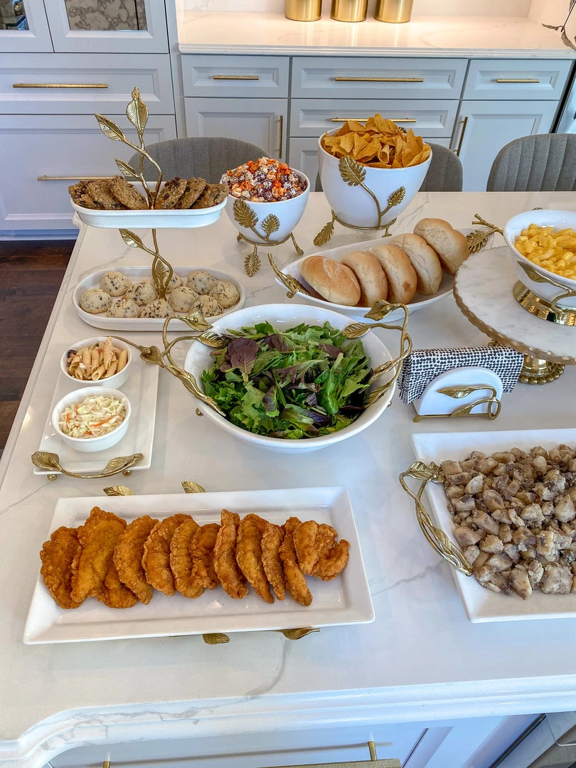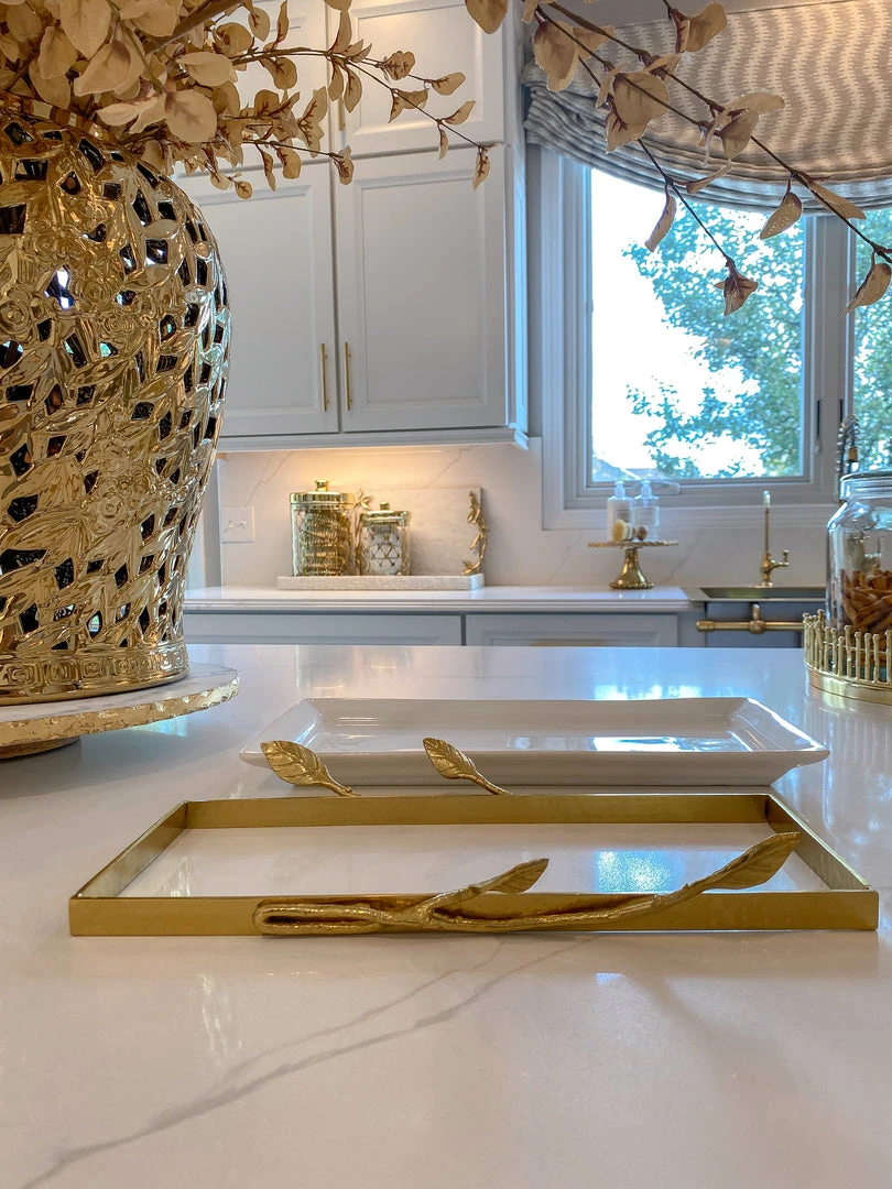 Description: This beautiful tray is a great piece of elegant design. The gold leaves compliment the glossy white ceramic to create a timeless look of sheer elegance and glam.