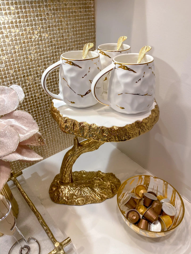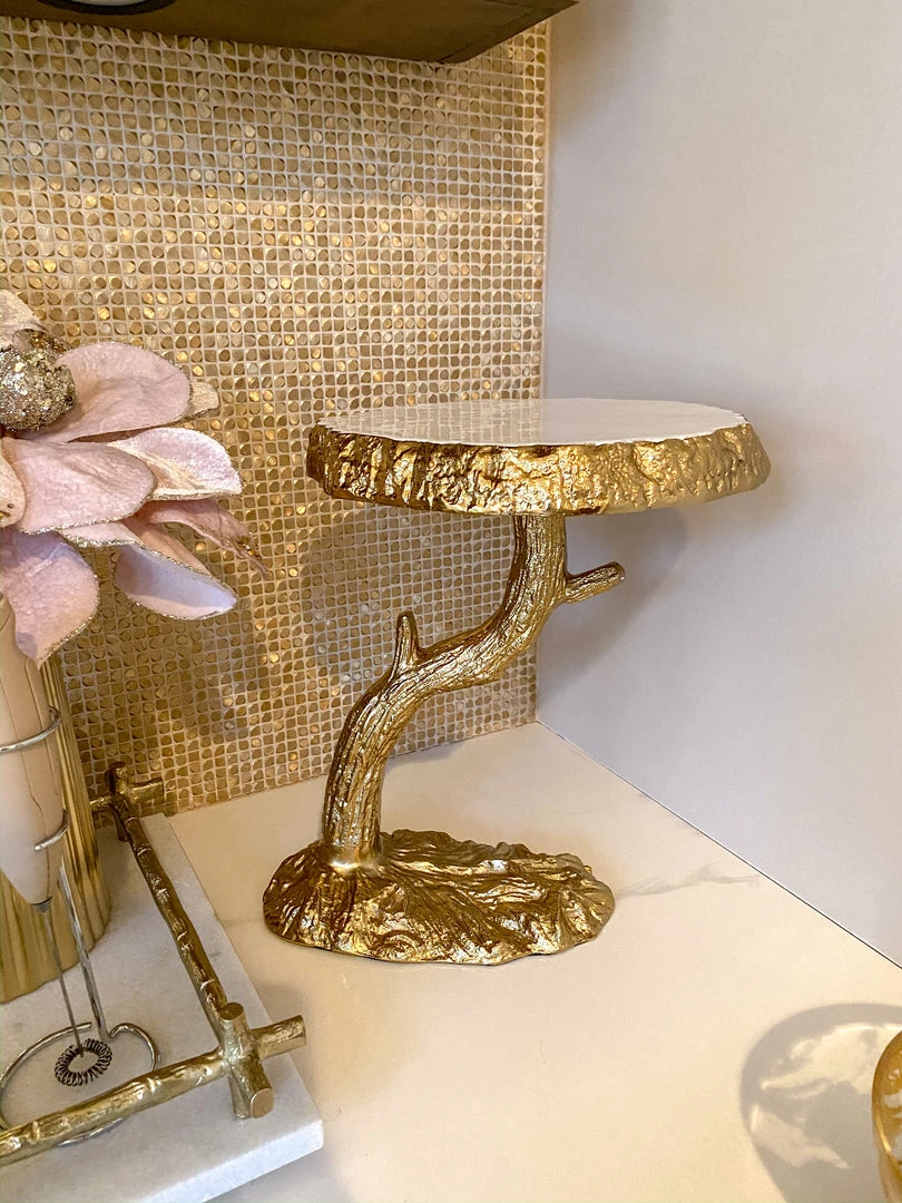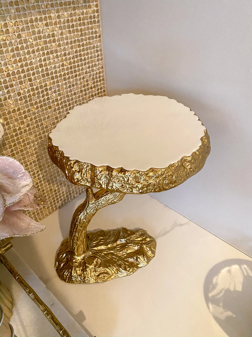 Description: Enchant and inspire your guests with this beautiful organic cake stand. The marble tray sit atop a gold tree design and makes a beauitful display for your favorite sweet treats.