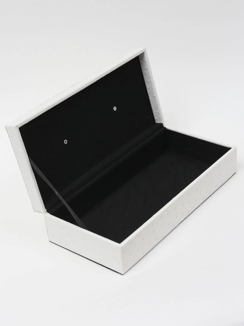 Description: This stunning white ostrich-textured faux leather lidded box is finished with a sleek gold bamboo shaped handle is the perfect place to store your remote controls. The black flannel lining is perfect to store your favorite jewelry or mementos as well.