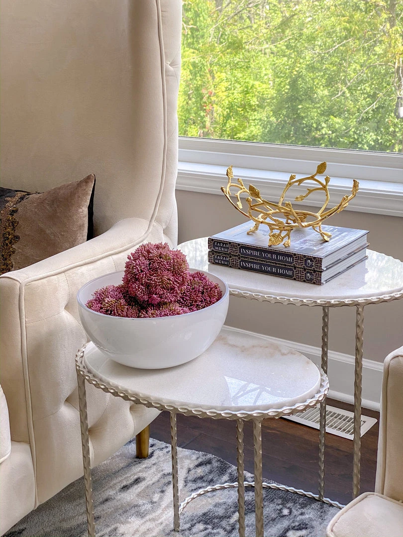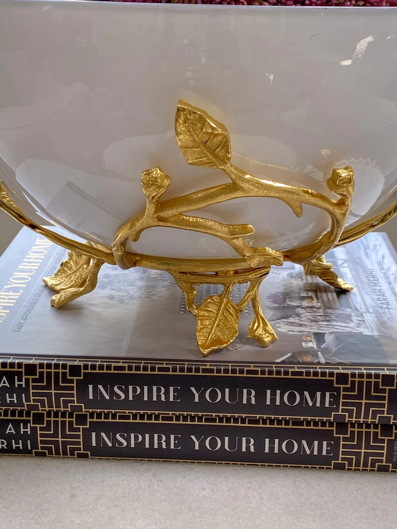 This white glass bowl with a gold leaf-shaped metal base is a great statement decor piece on its own or with other decor placed inside of it.