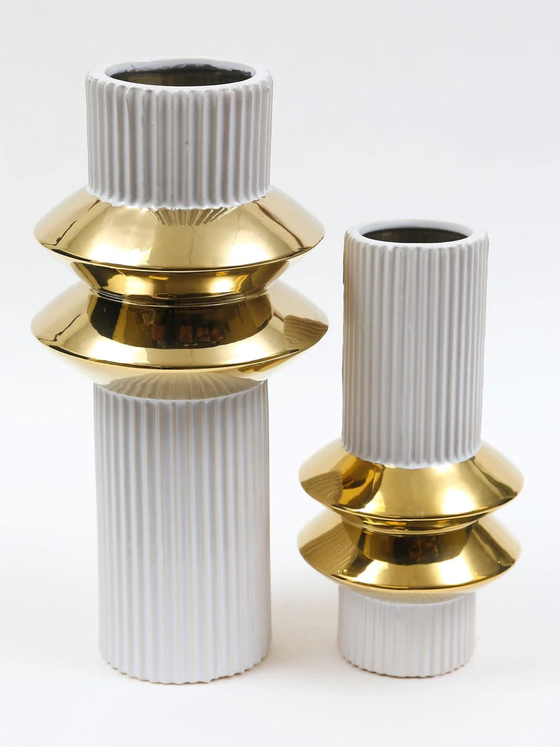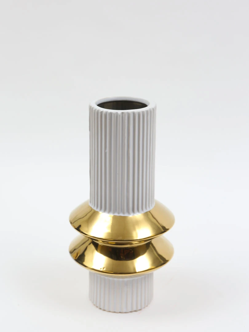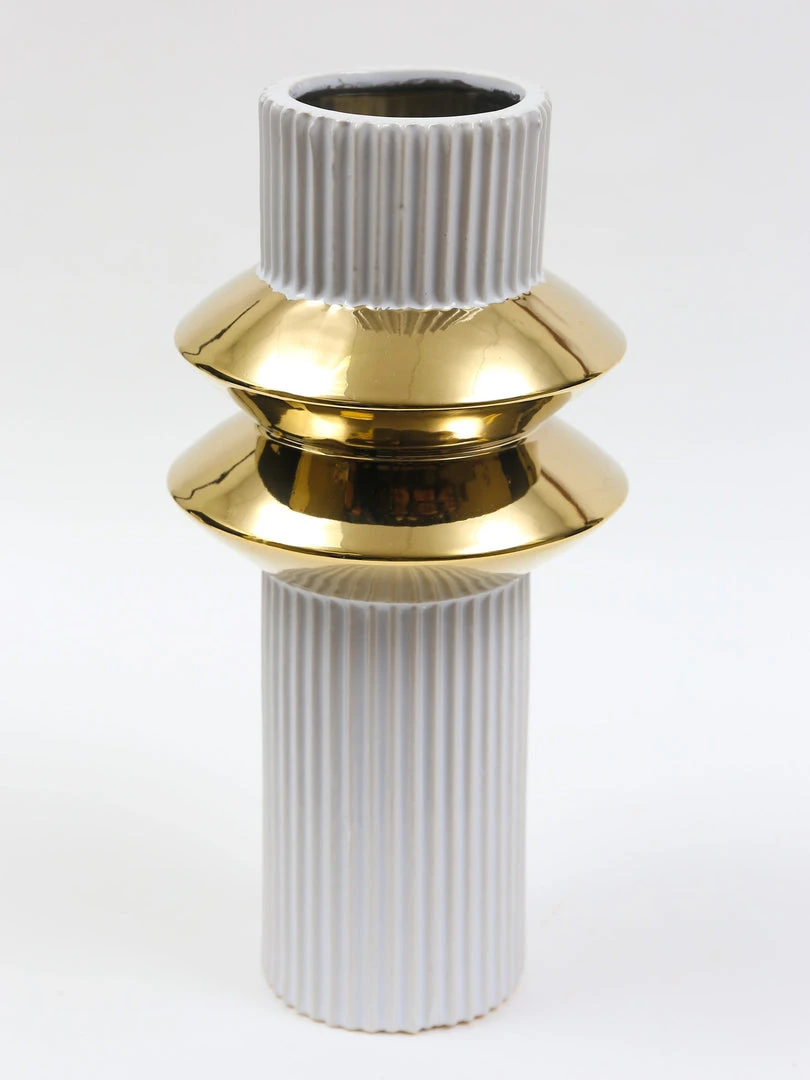 Description: This abstract white and gold vase is fabulous! Style with faux florals for every season!