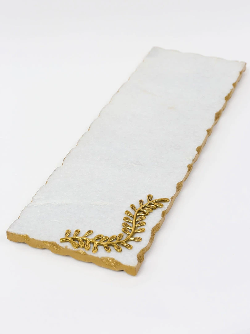 Description: This beautiful marble tray is the perfect for your coffee station or coffee table. The Curry Leaf on the edge has the perfect amount of detail for every display!