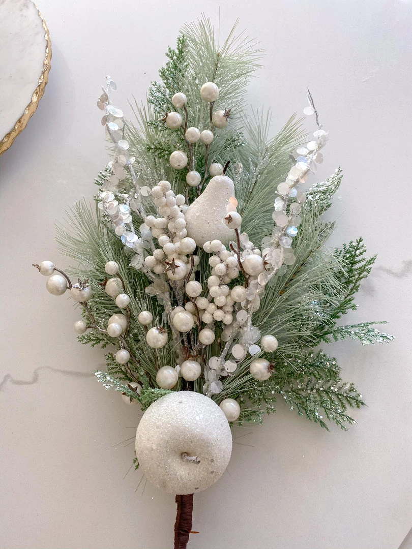 This stunning white pine spray is a signicant stem. It features white frosted apples and gittered berries. These can be beautifully styled in a vase or on a tree!