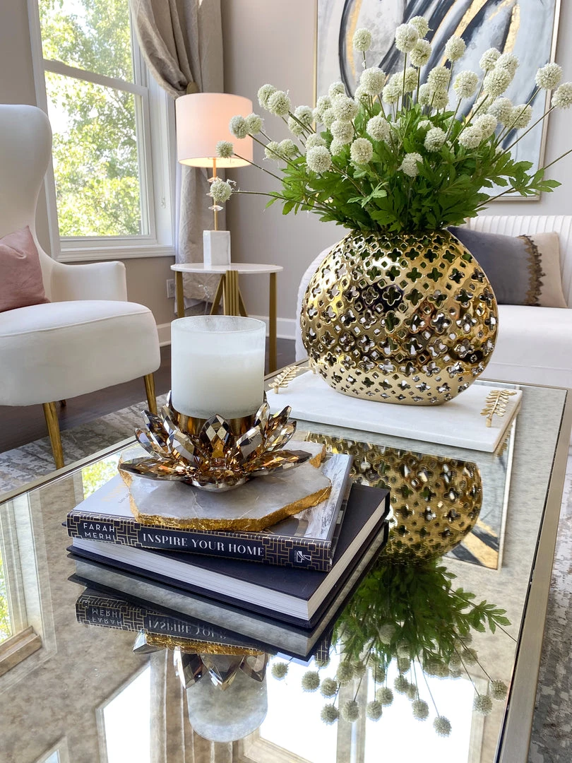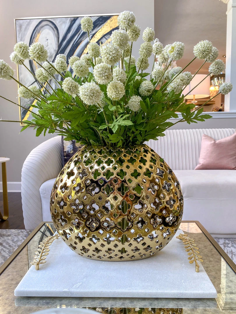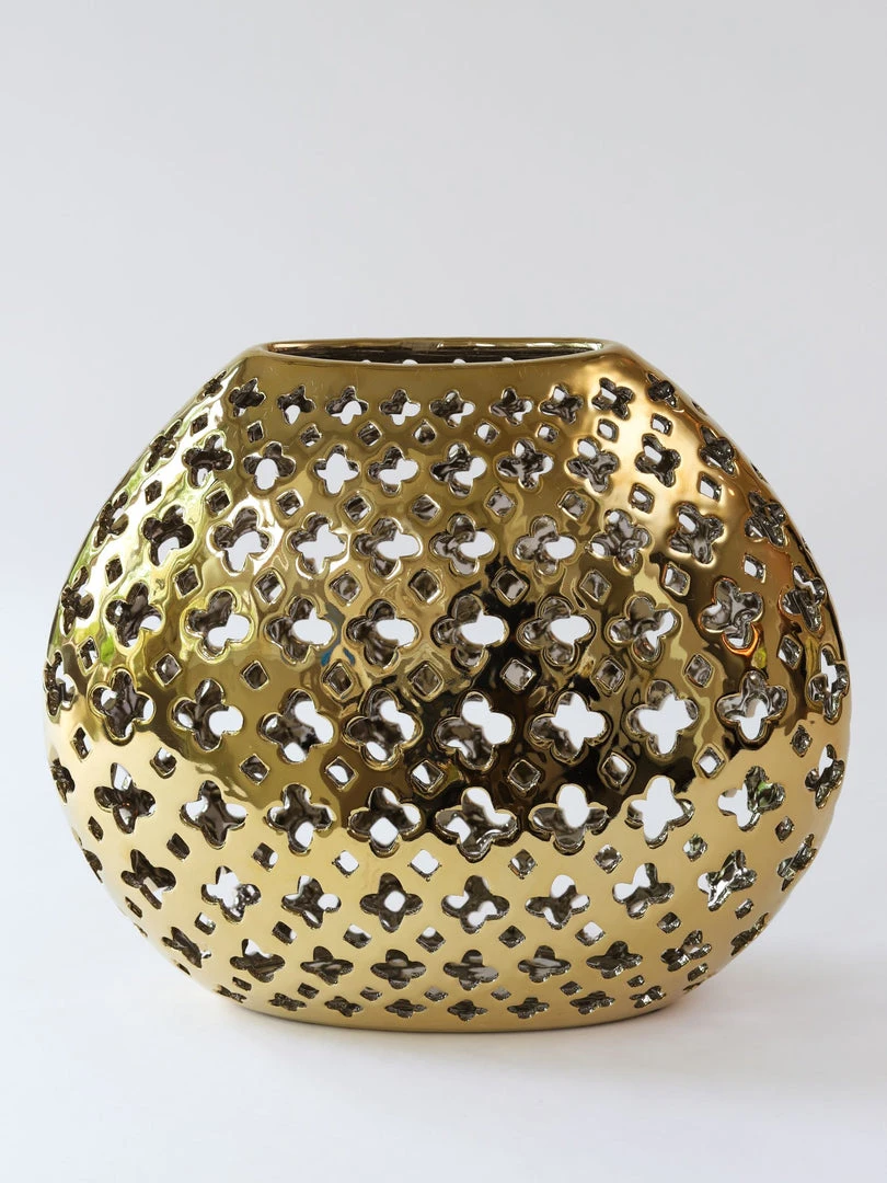 Description: This beautiful gold vase features a unique cut-out design. The unique features make this piece exceedingly elegant and absolutely stunning!