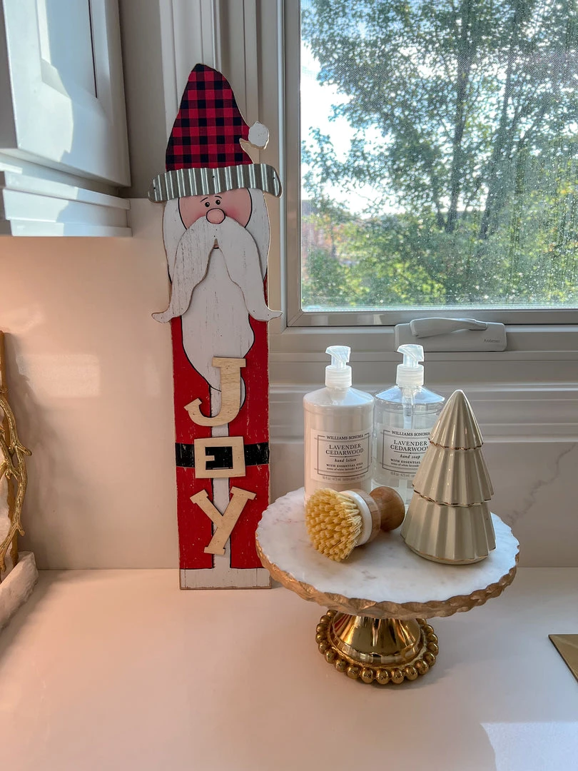 Description: Get your home ready for the holidays with these wooden Santa signs. They have a hook on the back to hang or you can stand them up!